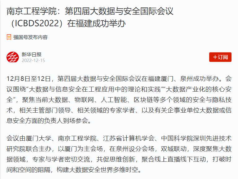 12月8日至12日,第四届大数据与安全国际会议在福建厦门、泉州成功举办。会议围绕“大数据与信息安全在工程应用中的理论和实践”“大数据产业化的核心安全”,聚焦当前大数据、物联网、人工智能、区块链等多个领域的安全与隐私技术,相关主管部门领导、相关领域的专家学者、以及有关企事业单位大数据或信息安全方面的负责人到场参会。