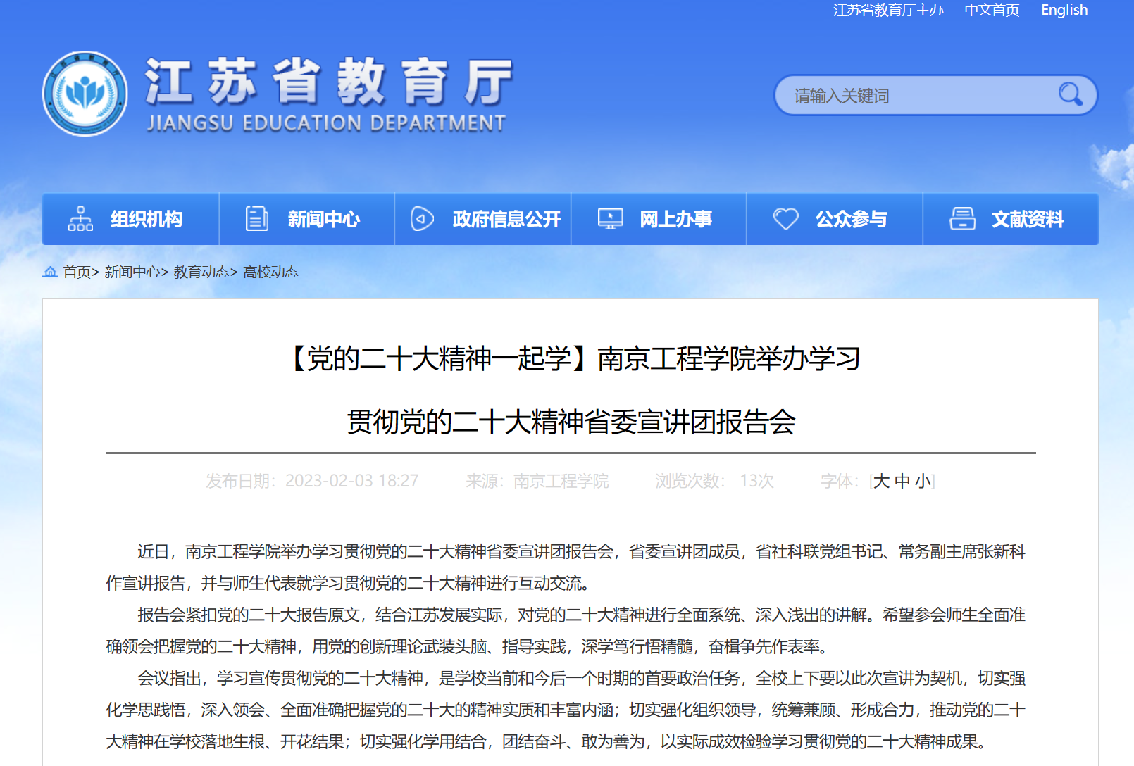 报告会紧扣党的二十大报告原文,结合江苏发展实际,对党的二十大精神进行全面系统、深入浅出的讲解。希望参会师生全面准确领会把握党的二十大精神,用党的创新理论武装头脑、指导实践,深学笃行悟精髓,奋楫争先作表率。