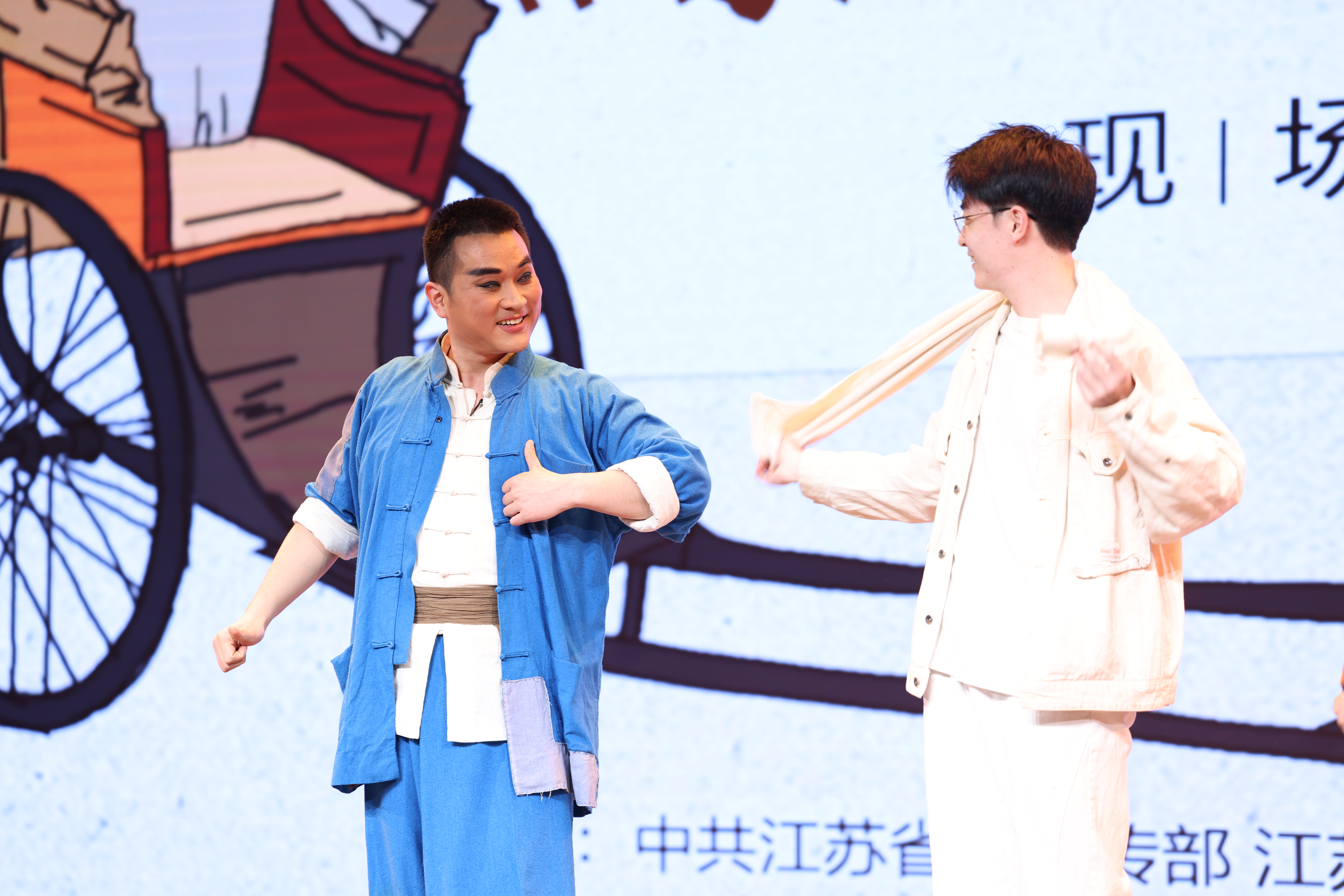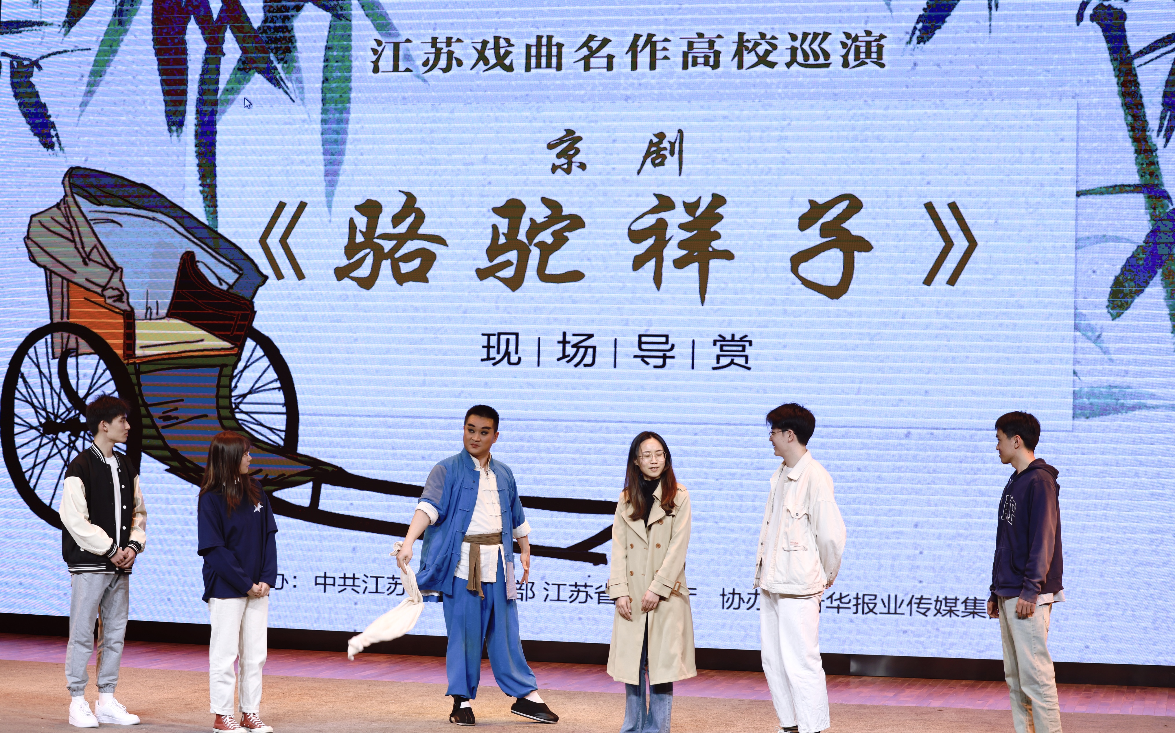 传统戏剧离年轻人有多远?在演出正式开始前的导赏环节中,江苏省京剧院青年演员、剧中“祥子”的扮演者黄金朝首先讲述了自己演戏的心得体会,并为同学们示范了剧中人力车夫的标志性动作:用白毛巾拍打腿、臂——甩一下——搭在脖子上。接着,5位同学上台模仿,有模有样,让台下爆发出阵阵掌声和笑声,看似陌生的戏曲文化一下子和大家贴近了。“同学们,我们京剧有独特的喝彩方式,要是觉得台上演员这一段表演特别精彩,就要用最大的声音喊‘好——’”黄金朝的一番话,引起一片响亮而欢乐的叫好,把现场气氛推向高潮。
