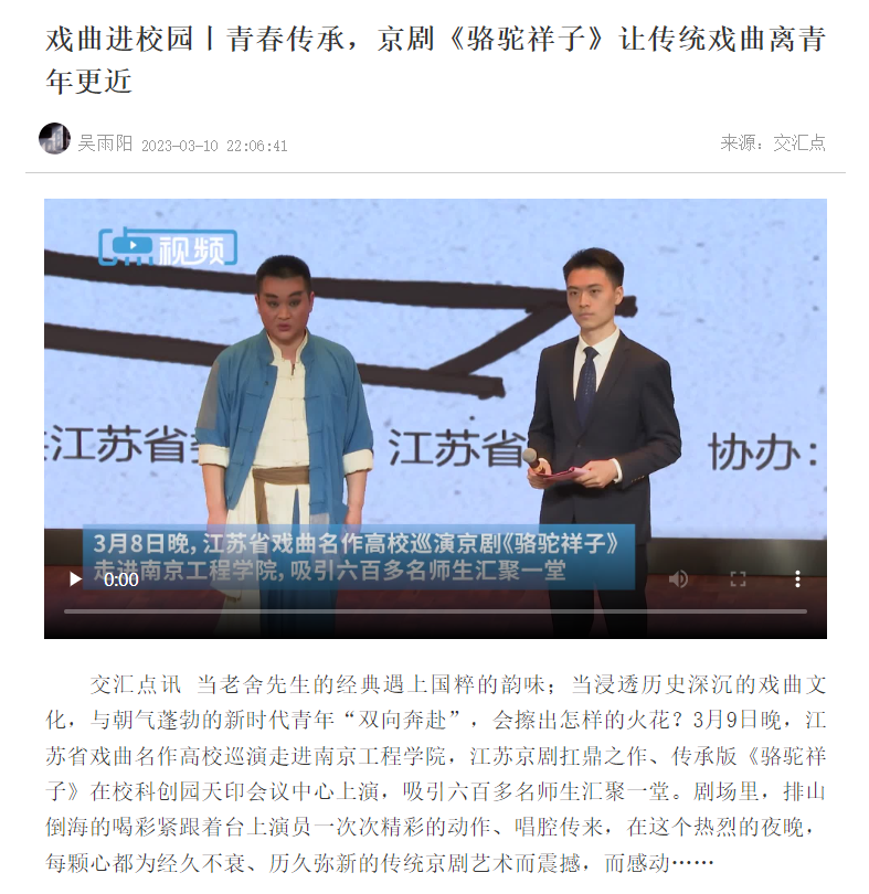 交汇点讯 当老舍先生的经典遇上国粹的韵味;当浸透历史深沉的戏曲文化,与朝气蓬勃的新时代青年“双向奔赴”,会擦出怎样的火花?3月9日晚,江苏省戏曲名作高校巡演走进15vip太阳集团官网,江苏京剧扛鼎之作、传承版《骆驼祥子》在校科创园天印会议中心上演,吸引六百多名师生汇聚一堂。剧场里,排山倒海的喝彩紧跟着台上演员一次次精彩的动作、唱腔传来,在这个热烈的夜晚,每颗心都为经久不衰、历久弥新的传统京剧艺术而震撼,而感动……