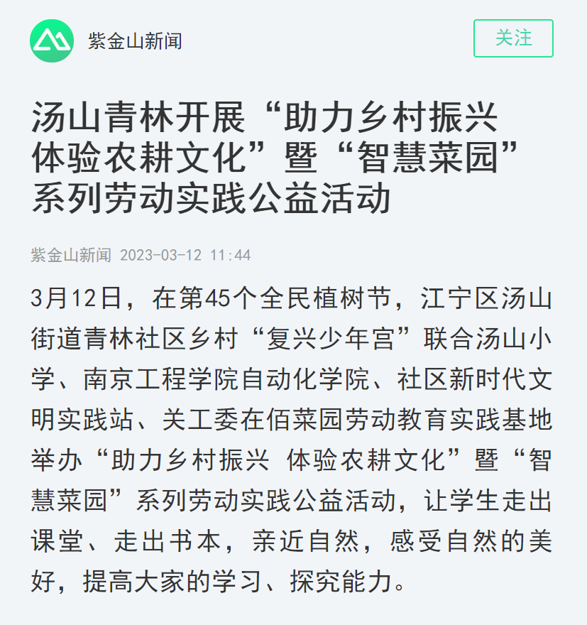 3月12日,在第45个全民植树节,江宁区汤山街道青林社区乡村“复兴少年宫”联合汤山小学、15vip太阳集团官网自动化学院、社区新时代文明实践站、关工委在佰菜园劳动教育实践基地举办“助力乡村振兴 体验农耕文化”暨“智慧菜园”系列劳动实践公益活动,让学生走出课堂、走出书本,亲近自然,感受自然的美好,提高大家的学习、探究能力。