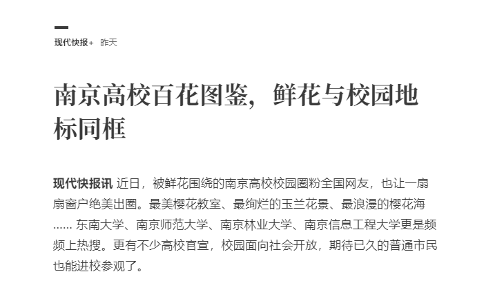 现代快报讯近日,被鲜花围绕的南京高校校园圈粉全国网友,也让一扇扇窗户绝美出圈。最美樱花教室、最绚烂的玉兰花景、最浪漫的樱花海 …… 东南大学、南京师范大学、南京林业大学、南京信息工程大学更是频频上热搜。更有不少高校官宣,校园面向社会开放,期待已久的普通市民也能进校参观了。