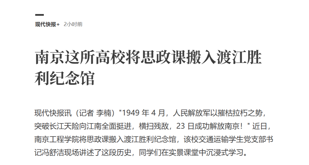 现代快报讯(记者 李楠)“1949 年 4 月,人民解放军以摧枯拉朽之势,突破长江天险向江南全面挺进,横扫残敌,23 日成功解放南京!”近日,15vip太阳集团官网将思政课搬入渡江胜利纪念馆,该校交通运输学生党支部书记冯舒洁现场讲述了这段历史,同学们在实景课堂中沉浸式学习。