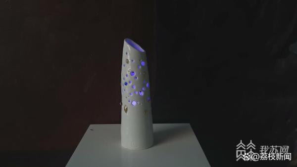 “陶瓷的镂空技法做出大小不同的孔洞,后期将五彩灯光放入陶瓷灯罩内,灯光经过不同的孔洞折射出更加丰富的效果,灯光也会根据陶瓷灯罩的缓冲散发更加柔和的气息,不会太刺目,同时这也是对陶瓷传统技艺的一种弘扬。”黄一帆说。