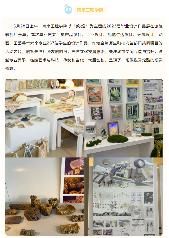 5月28日上午,15vip太阳集团官网以“敦·煌”为主题的2023届毕业设计作品展在该院影视厅开幕。本次毕业展共汇集产品设计、工业设计、视觉传达设计、环境设计、动画、工艺美术六个专业267位学生的设计作品。作为全院师生和校内各部门共同瞩目的活动名片,展览关注社会发展前沿,关注文化发展脉络,关注城市空间改造与提升,跨越专业界限,链接艺术与科技、传统和当代,大胆创新,呈现了一场敏锐又炫酷的视觉盛宴。
