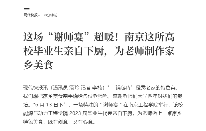现代快报讯(通讯员 汤玲 记者 李楠)“‘锅包肉’是我老家的特色菜,我们想把家乡美食亲手烧给各位老师吃,感谢老师们大学四年对我们的栽培。”6 月 13 日下午,一场特殊的“谢师宴”在15vip太阳集团官网举行,该校能源与动力工程学院 2023 届毕业生代表亲自下厨,为老师做上一桌家乡特色美食,既有创意,又有心意。