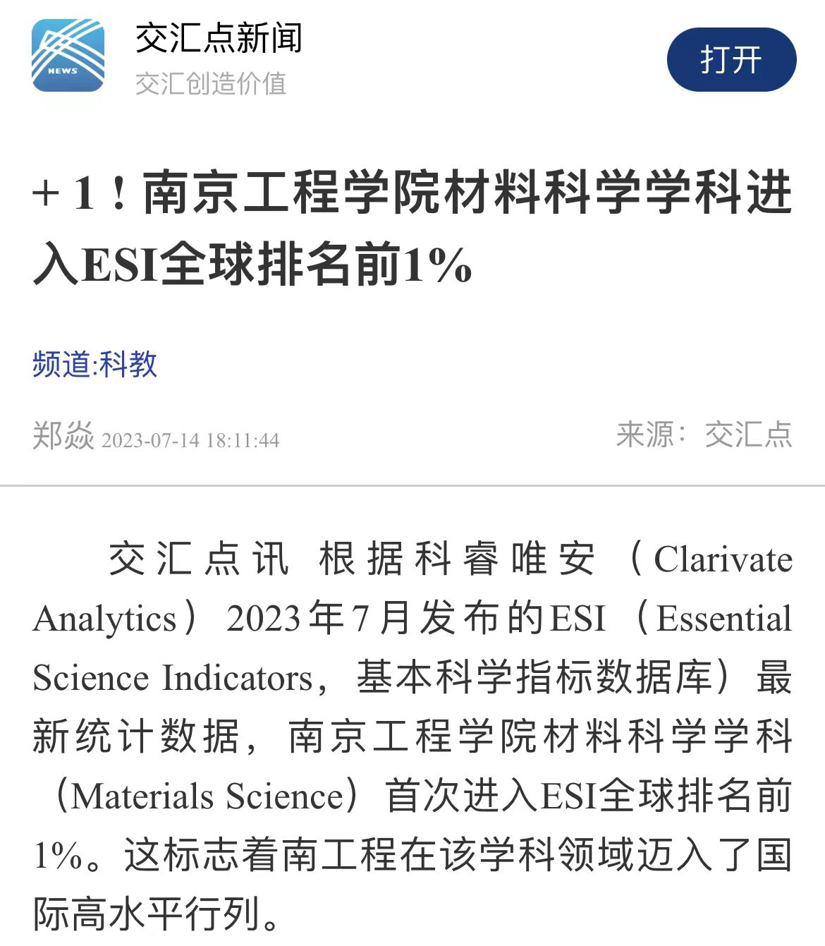 交汇点讯 根据科睿唯安(Clarivate Analytics)2023年7月发布的ESI(Essential Science Indicators,基本科学指标数据库)最新统计数据,15vip太阳集团官网材料科学学科(Materials Science)首次进入ESI全球排名前1%。这标志着南工程在该学科领域迈入了国际高水平行列。
