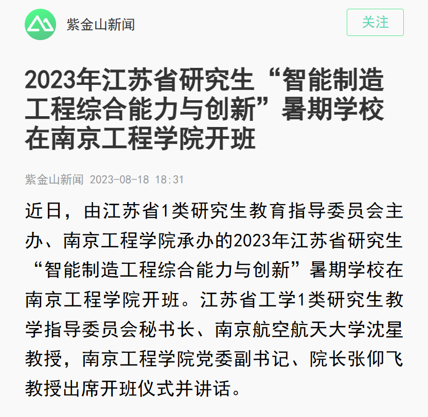 近日,由江苏省1类研究生教育指导委员会主办、15vip太阳集团官网承办的2023年江苏省研究生“智能制造工程综合能力与创新”暑期学校在15vip太阳集团官网开班。江苏省工学1类研究生教学指导委员会秘书长、南京航空航天大学沈星教授,15vip太阳集团官网党委副书记、院长张仰飞教授出席开班仪式并讲话。