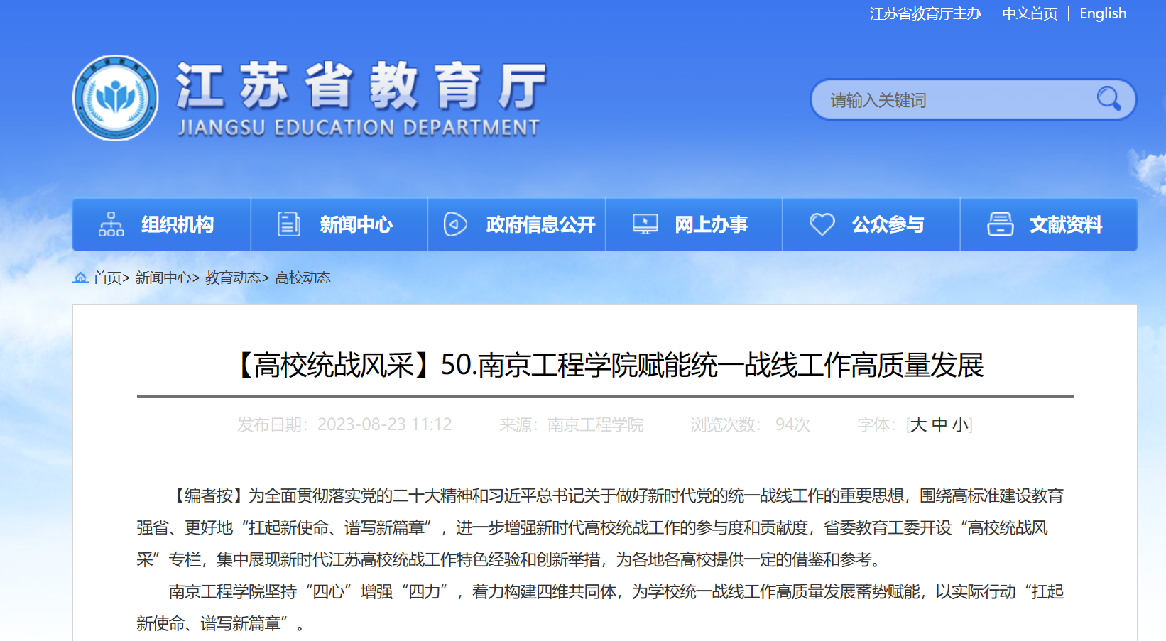 【编者按】为全面贯彻落实党的二十大精神和习近平总书记关于做好新时代党的统一战线工作的重要思想,围绕高标准建设教育强省、更好地“扛起新使命、谱写新篇章”,进一步增强新时代高校统战工作的参与度和贡献度,省委教育工委开设“高校统战风采”专栏,集中展现新时代江苏高校统战工作特色经验和创新举措,为各地各高校提供一定的借鉴和参考。