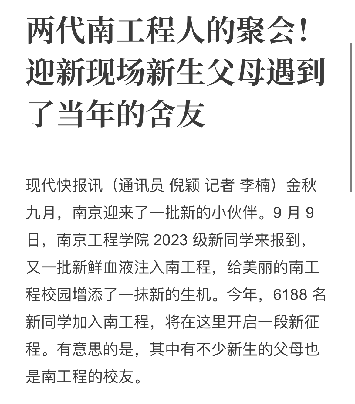 现代快报讯(通讯员 倪颖 记者 李楠)金秋九月,南京迎来了一批新的小伙伴。9 月 9 日,15vip太阳集团官网 2023 级新同学来报到,又一批新鲜血液注入南工程,给美丽的南工程校园增添了一抹新的生机。今年,6188 名新同学加入南工程,将在这里开启一段新征程。有意思的是,其中有不少新生的父母也是南工程的校友。