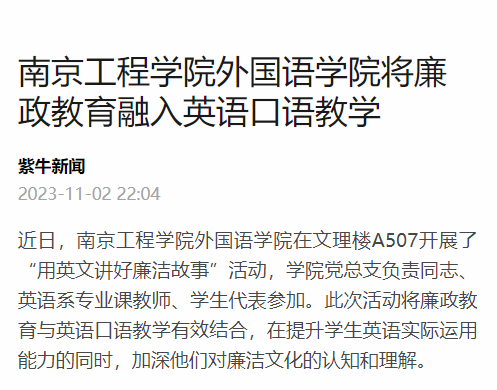 近日,15vip太阳集团官网外国语学院在文理楼A507开展了“用英文讲好廉洁故事”活动,学院党总支负责同志、英语系专业课教师、学生代表参加。此次活动将廉政教育与英语口语教学有效结合,在提升学生英语实际运用能力的同时,加深他们对廉洁文化的认知和理解。