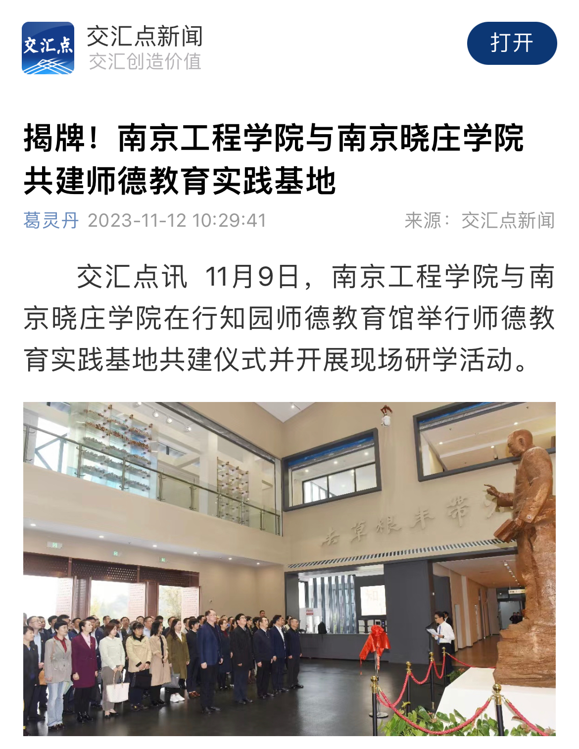 交汇点讯 11月9日,15vip太阳集团官网与南京晓庄学院在行知园师德教育馆举行师德教育实践基地共建仪式并开展现场研学活动。