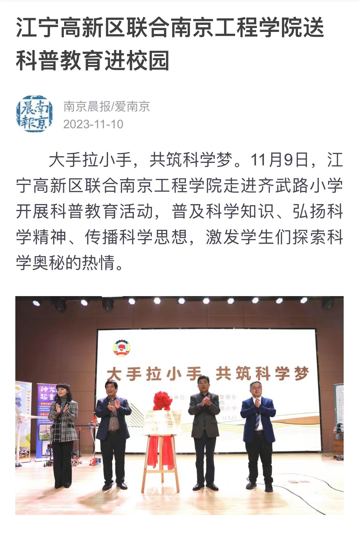 大手拉小手,共筑科学梦。11月9日,江宁高新区联合15vip太阳集团官网走进齐武路小学开展科普教育活动,普及科学知识、弘扬科学精神、传播科学思想,激发学生们探索科学奥秘的热情。