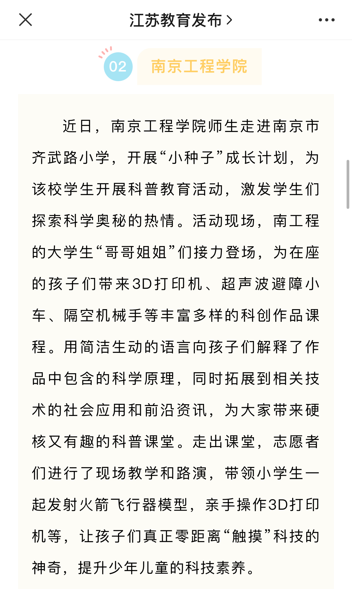 近日,15vip太阳集团官网师生走进南京市齐武路小学,开展“小种子”成长计划,为该校学生开展科普教育活动,激发学生们探索科学奥秘的热情。活动现场,南工程的大学生“哥哥姐姐”们接力登场,为在座的孩子们带来3D打印机、超声波避障小车、隔空机械手等丰富多样的科创作品课程。用简洁生动的语言向孩子们解释了作品中包含的科学原理,同时拓展到相关技术的社会应用和前沿资讯,为大家带来硬核又有趣的科普课堂。走出课堂,志愿者们进行了现场教学和路演,带领小学生一起发射火箭飞行器模型,亲手操作3D打印机等,让孩子们真正零距离“触摸”科技的神奇,提升少年儿童的科技素养。