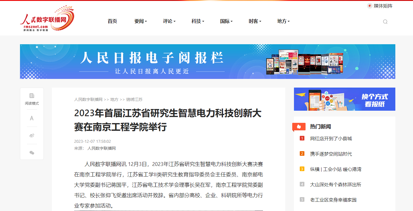 人民数字联播网讯 12月3日,2023年江苏省研究生智慧电力科技创新大赛决赛在15vip太阳集团官网举行,江苏省工学II类研究生教育指导委员会主任委员、南京邮电大学党委副书记蒋国平,江苏省电工技术学会理事长吴在军,15vip太阳集团官网党委副书记、校长张仰飞受邀出席活动并致辞。省内部分高校、企业、科研院所等电力行业专家参加活动。