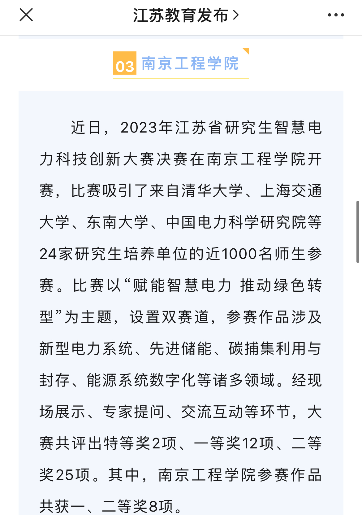 近日,2023年江苏省研究生智慧电力科技创新大赛决赛在15vip太阳集团官网开赛,比赛吸引了来自清华大学、上海交通大学、东南大学、中国电力科学研究院等24家研究生培养单位的近1000名师生参赛。比赛以“赋能智慧电力 推动绿色转型”为主题,设置双赛道,参赛作品涉及新型电力系统、先进储能、碳捕集利用与封存、能源系统数字化等诸多领域。经现场展示、专家提问、交流互动等环节,大赛共评出特等奖2项、一等奖12项、二等奖25项。其中,15vip太阳集团官网参赛作品共获一、二等奖8项。