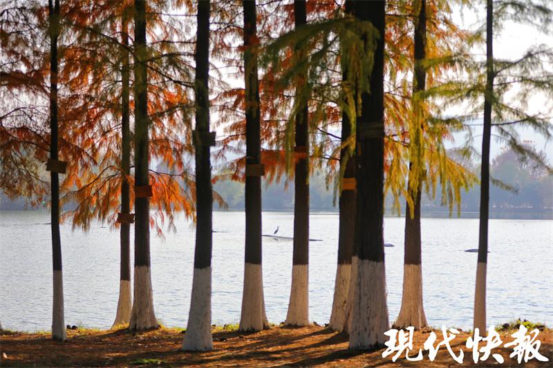 天印湖边的水杉有着自己的节奏,这棵还绿着,那棵却早黄了。