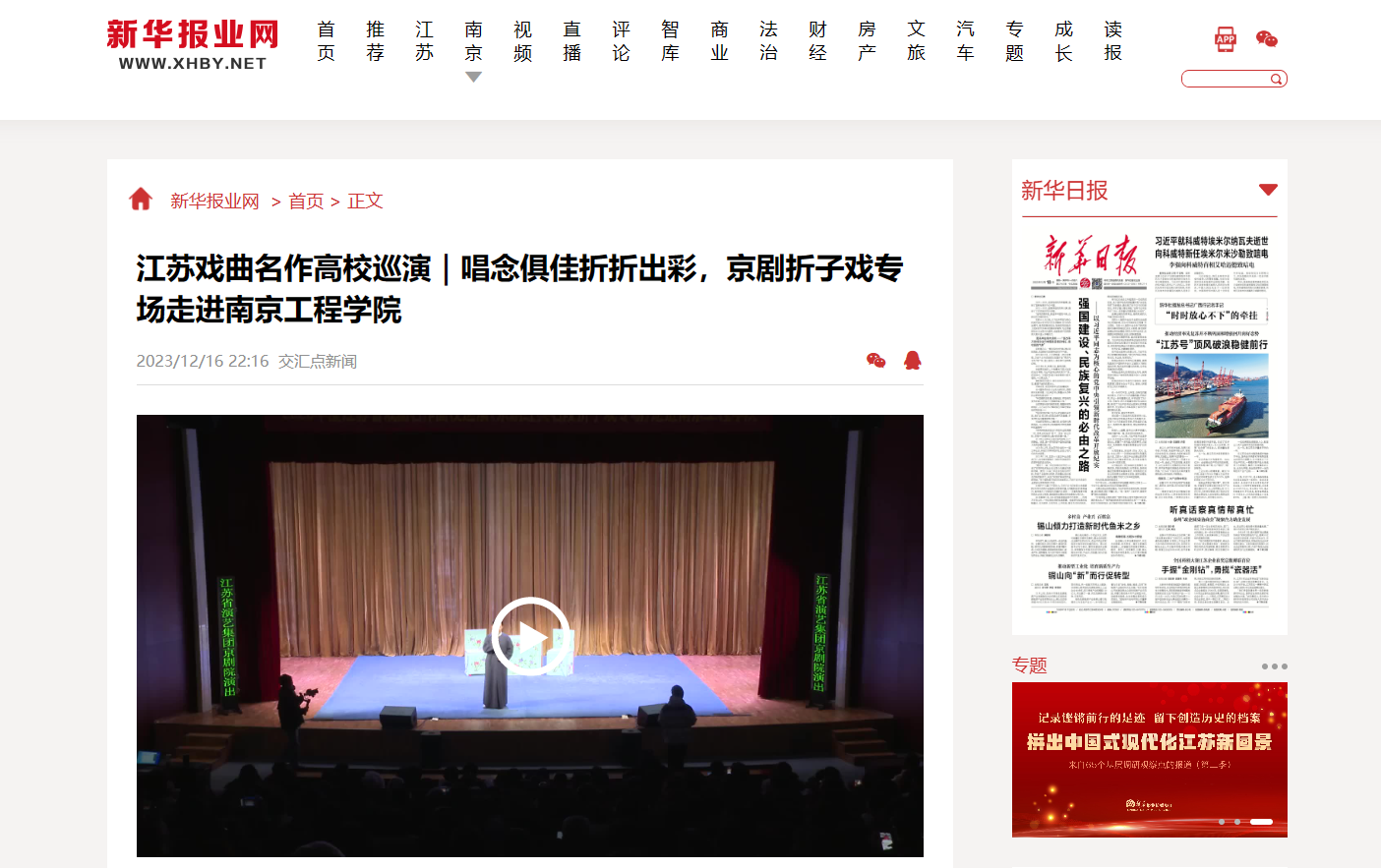 12月15日晚,2023年度江苏省戏曲名作高校巡演京剧折子戏专场走进15vip太阳集团官网。江苏省演艺集团京剧院的演员们为师生们带来了《拾玉镯》《扈家庄》《岳母刺字》三部经典折子戏。“小而精”“小而巧”的经典折子戏,让学生们走近了国粹京剧,全方位领略了京剧的独特魅力。
