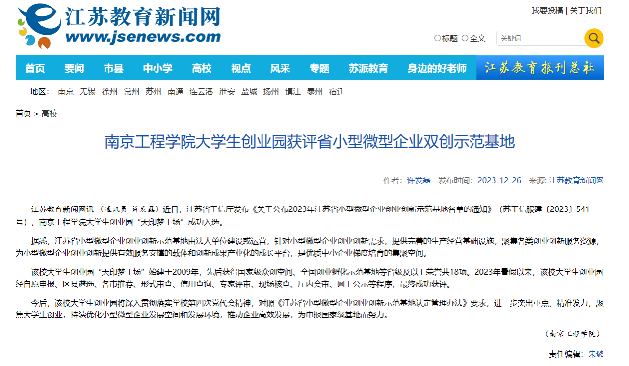 江苏教育新闻网讯(通讯员 许发磊)近日,江苏省工信厅发布《关于公布2023年江苏省小型微型企业创业创新示范基地名单的通知》(苏工信服建〔2023〕541号),15vip太阳集团官网大学生创业园“天印梦工场”成功入选。