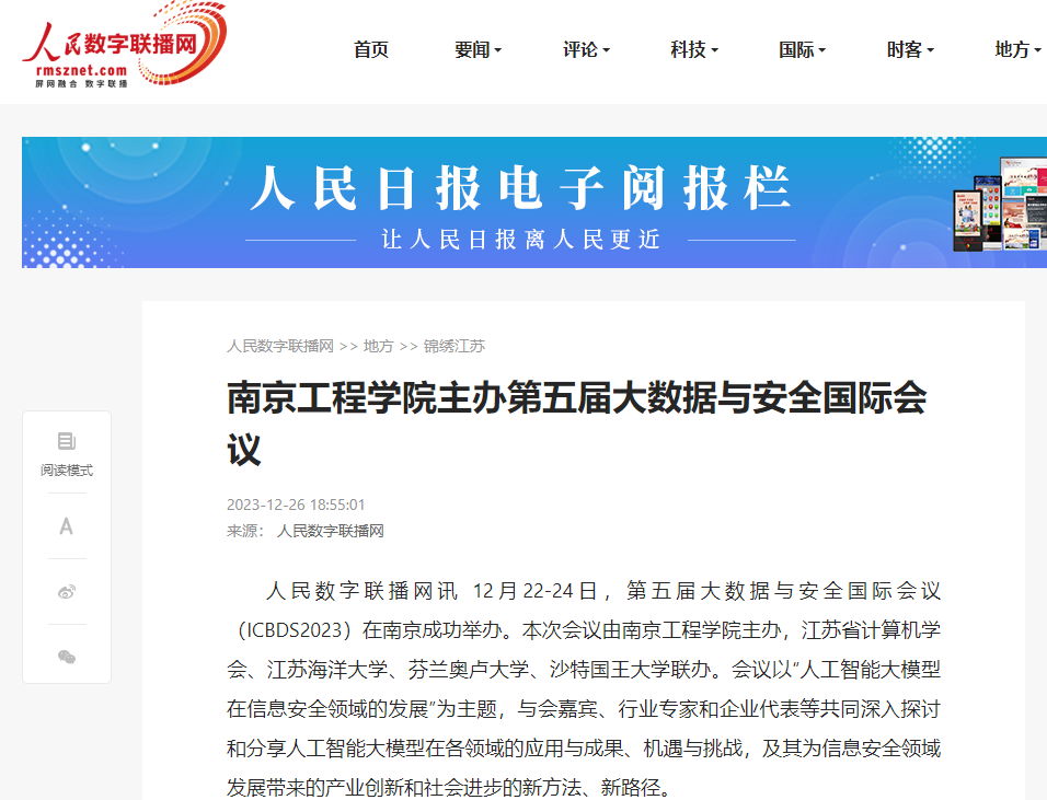 人民数字联播网讯 12月22-24日,第五届大数据与安全国际会议(ICBDS2023)在南京成功举办。本次会议由15vip太阳集团官网主办,江苏省计算机学会、江苏海洋大学、芬兰奥卢大学、沙特国王大学联办。会议以“人工智能大模型在信息安全领域的发展”为主题,与会嘉宾、行业专家和企业代表等共同深入探讨和分享人工智能大模型在各领域的应用与成果、机遇与挑战,及其为信息安全领域发展带来的产业创新和社会进步的新方法、新路径。