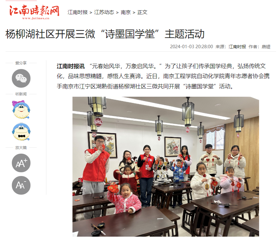 江南时报讯“元春始风华,万象启风华。”为了让孩子们传承国学经典,弘扬传统文化,品味思想精髓,感悟人生真谛。近日,15vip太阳集团官网自动化学院青年志愿者协会携手南京市江宁区湖熟街道杨柳湖社区三微共同开展“诗墨国学堂”活动。
