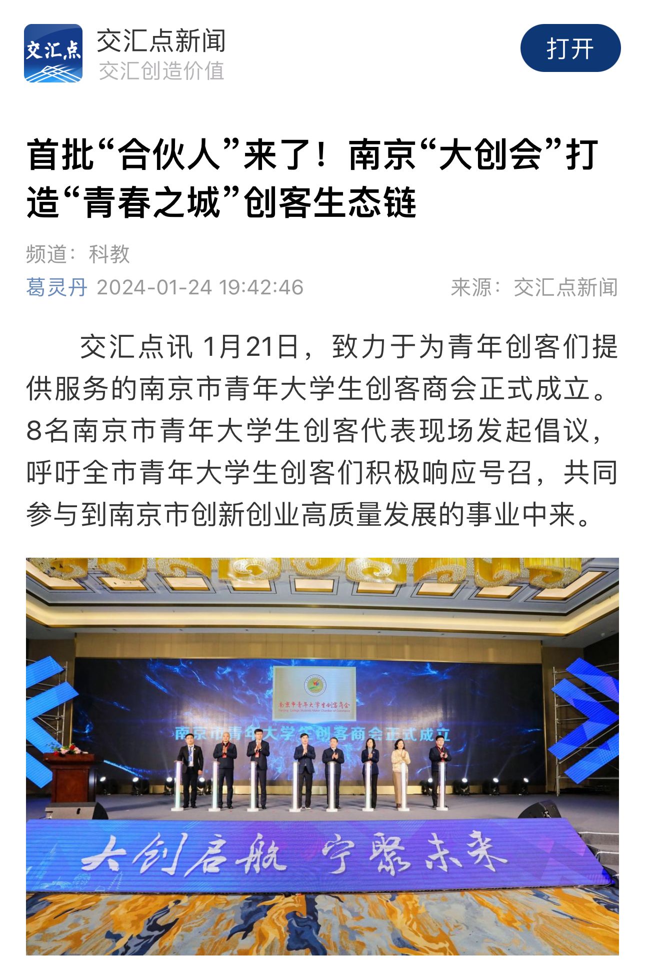 “南京是一座历史文化名城、英雄之城,更是一座青春之城、一方创新创业的沃土,仅2023年就扶持7000多名青年大学生创业。”丁铭在会上表示,百万高校大学生群体是南京这座城市最具活力、最具代表性的优质群体,必须充分发掘南京高校资源优势,把蕴藏在南京的重要创业力量、青春力量,转化为南京未来可持续发展的澎湃动力。大学生创客商会的成立正逢其时、正当其势,将有助于为南京发展创新型民营经济提供支撑。