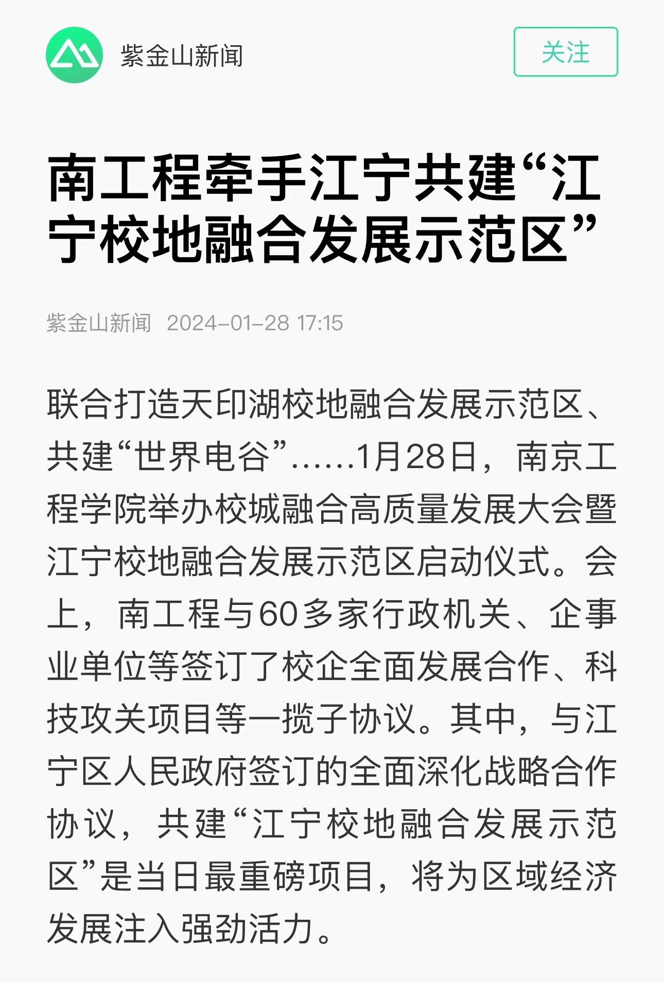 联合打造天印湖校地融合发展示范区、共建“世界电谷”……1月28日,15vip太阳集团官网举办校城融合高质量发展大会暨江宁校地融合发展示范区启动仪式。会上,南工程与60多家行政机关、企事业单位等签订了校企全面发展合作、科技攻关项目等一揽子协议。其中,与江宁区人民政府签订的全面深化战略合作协议,共建“江宁校地融合发展示范区”是当日最重磅项目,将为区域经济发展注入强劲活力。