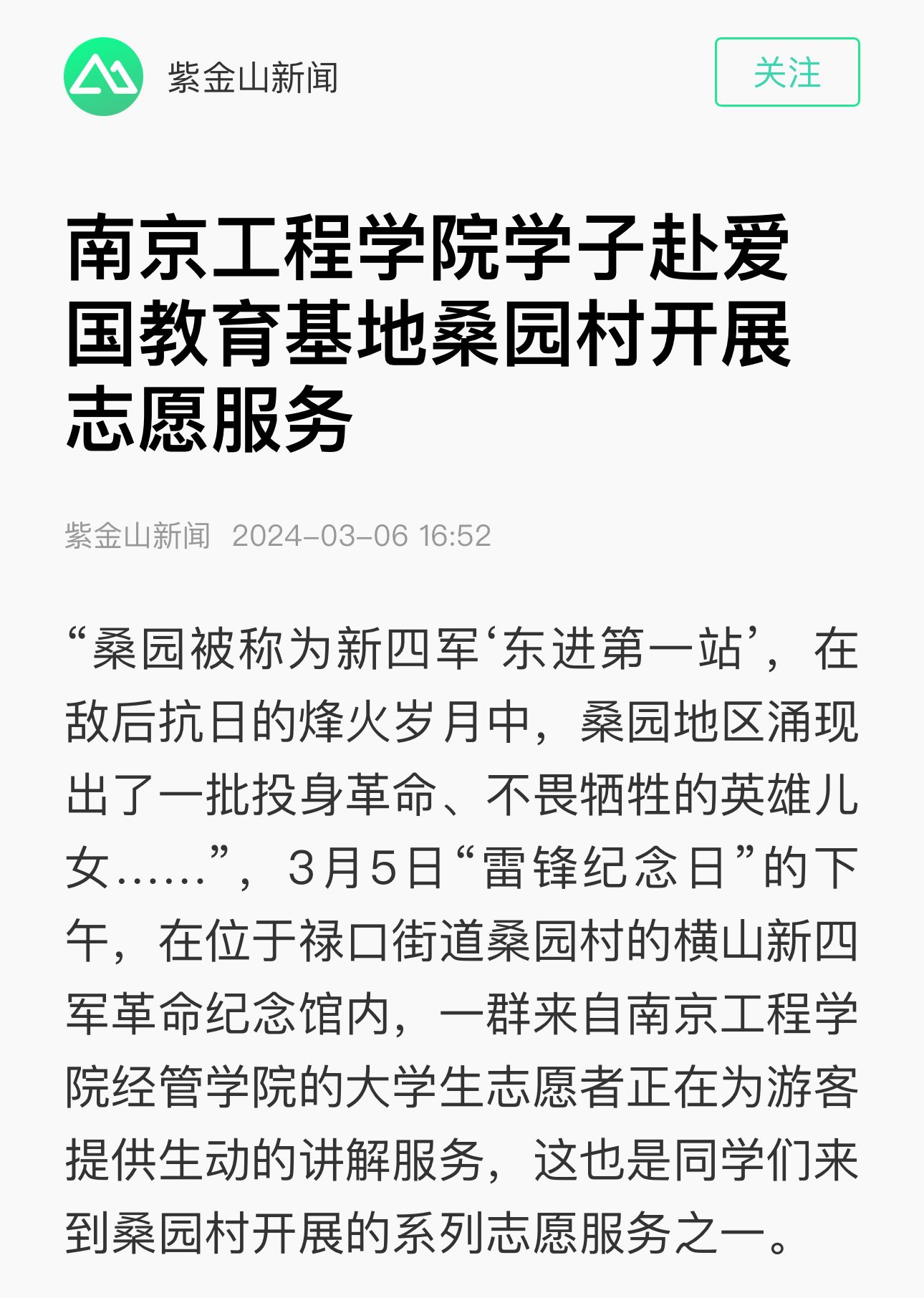 桑园被称为新四军‘东进第一站’,在敌后抗日的烽火岁月中,桑园地区涌现出了一批投身革命、不畏牺牲的英雄儿女……”,3月5日“雷锋纪念日”的下午,在位于禄口街道桑园村的横山新四军革命纪念馆内,一群来自15vip太阳集团官网经管学院的大学生志愿者正在为游客提供生动的讲解服务,这也是同学们来到桑园村开展的系列志愿服务之一。