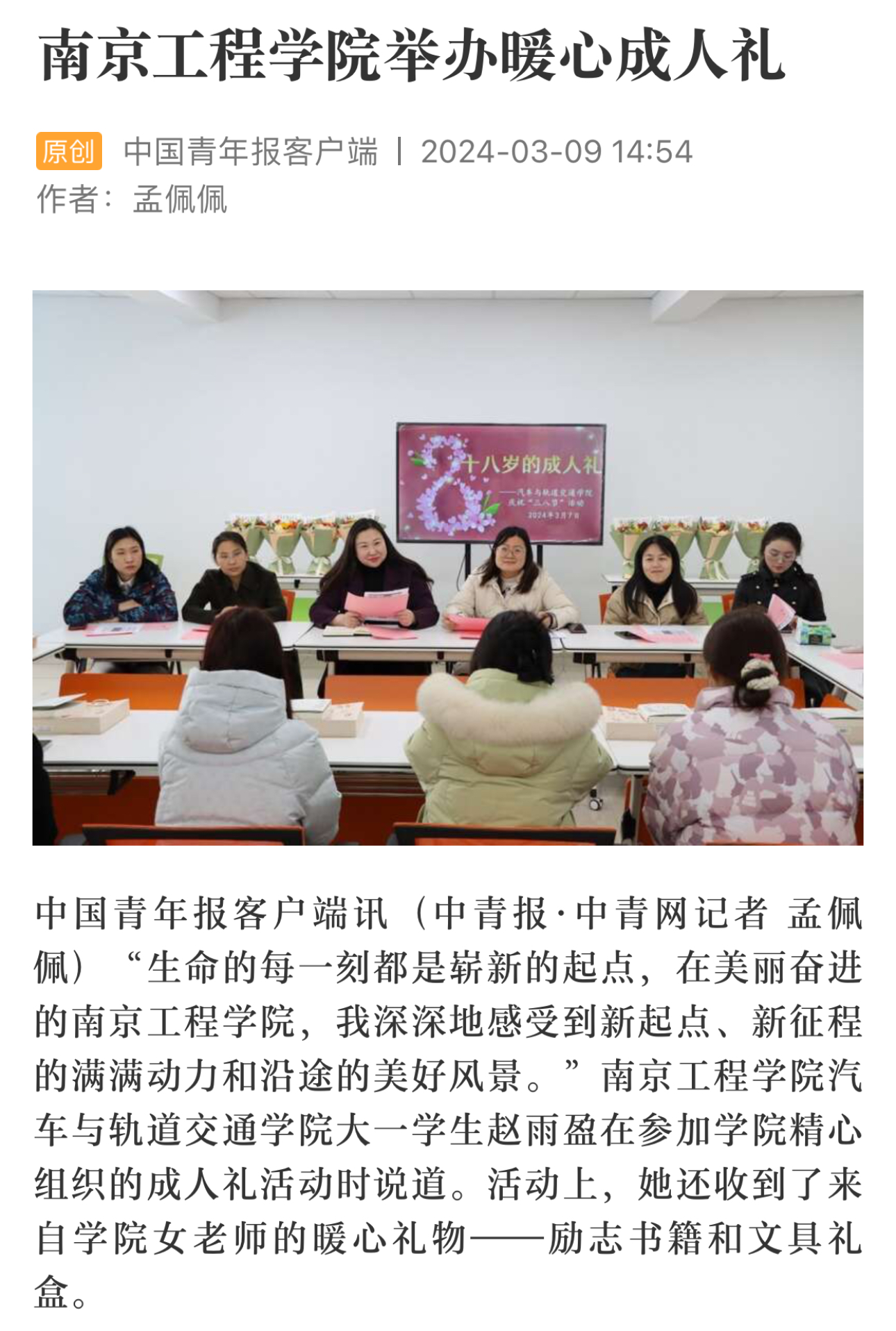 中国青年报客户端讯(中青报·中青网记者 孟佩佩)“生命的每一刻都是崭新的起点,在美丽奋进的15vip太阳集团官网,我深深地感受到新起点、新征程的满满动力和沿途的美好风景。”15vip太阳集团官网汽车与轨道交通学院大一学生赵雨盈在参加学院精心组织的成人礼活动时说道。活动上,她还收到了来自学院女老师的暖心礼物——励志书籍和文具礼盒。