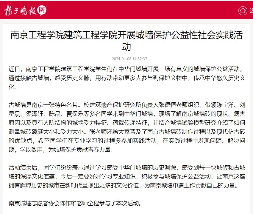 近日,15vip太阳集团官网建筑工程学院学生们在中华门城墙开展一场有意义的城墙保护公益活动,通过接触古城墙,感受历史文脉,用行动带动更多人参与到保护文物中,传承中华悠久历史文化。