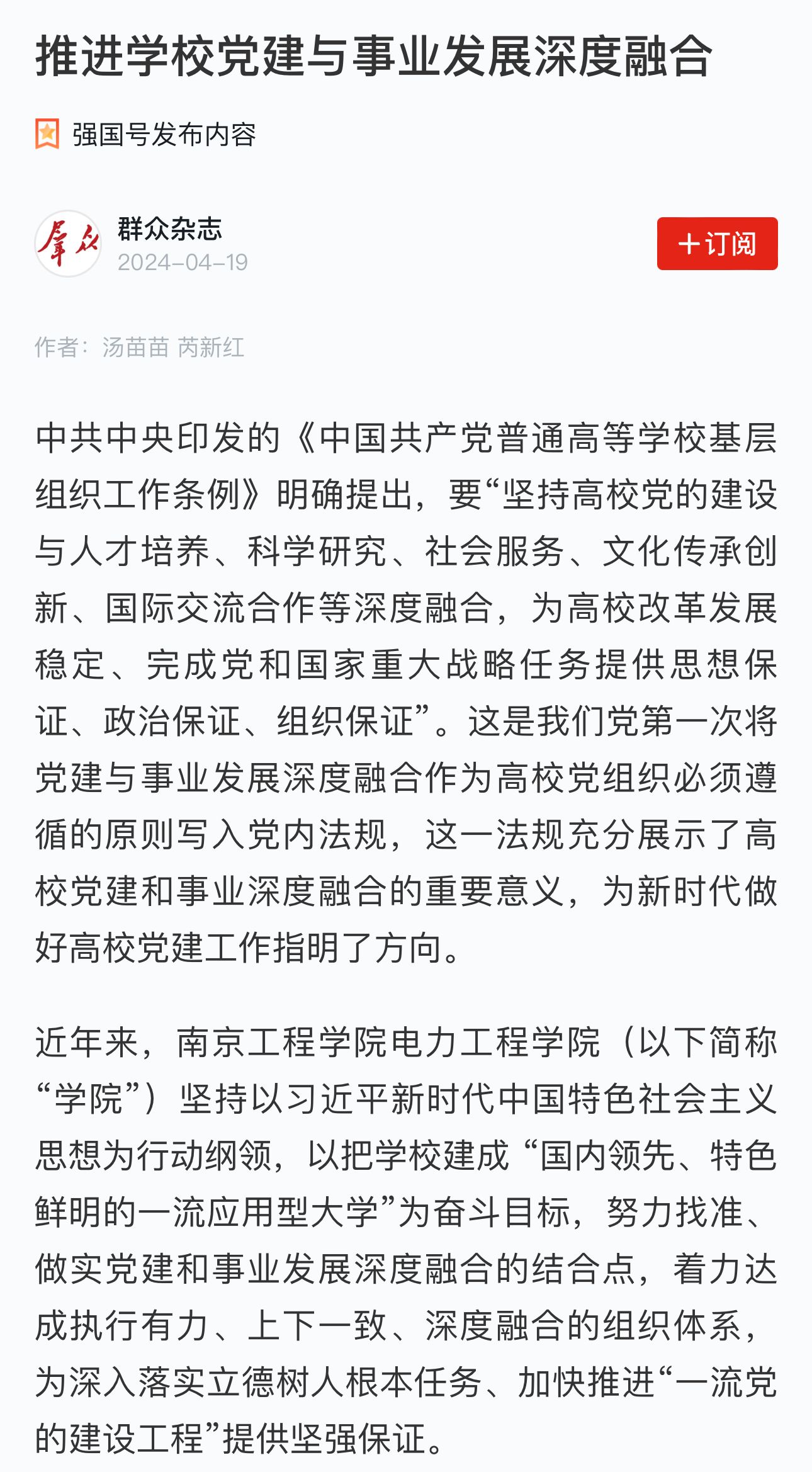 中共中央印发的《中国共产党普通高等学校基层组织工作条例》明确提出,要“坚持高校党的建设与人才培养、科学研究、社会服务、文化传承创新、国际交流合作等深度融合,为高校改革发展稳定、完成党和国家重大战略任务提供思想保证、政治保证、组织保证”。这是我们党第一次将党建与事业发展深度融合作为高校党组织必须遵循的原则写入党内法规,这一法规充分展示了高校党建和事业深度融合的重要意义,为新时代做好高校党建工作指明了方向。