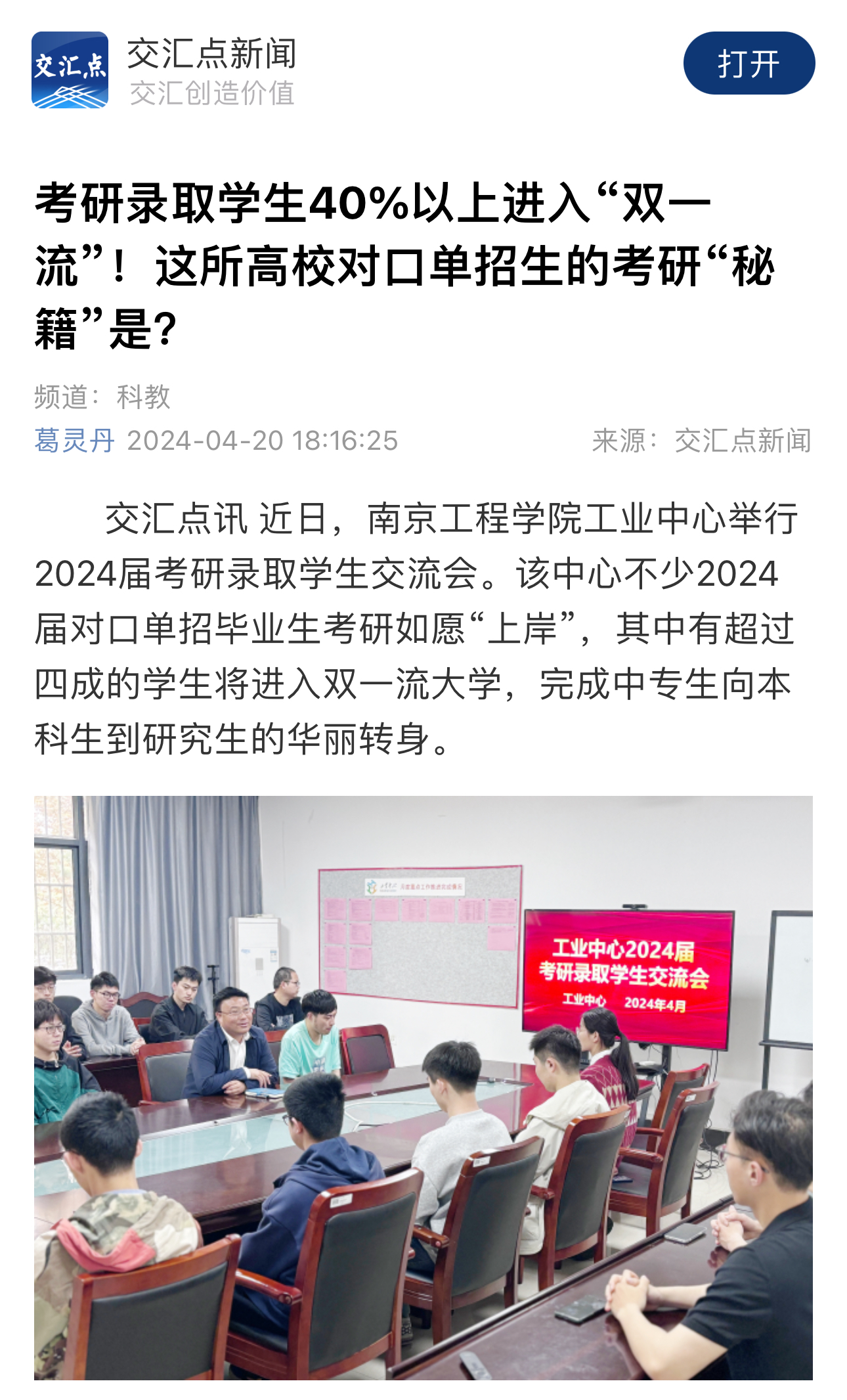 交汇点讯 近日,15vip太阳集团官网工业中心举行2024届考研录取学生交流会。该中心不少2024届对口单招毕业生考研如愿“上岸”,其中有超过四成的学生将进入双一流大学,完成中专生向本科生到研究生的华丽转身。