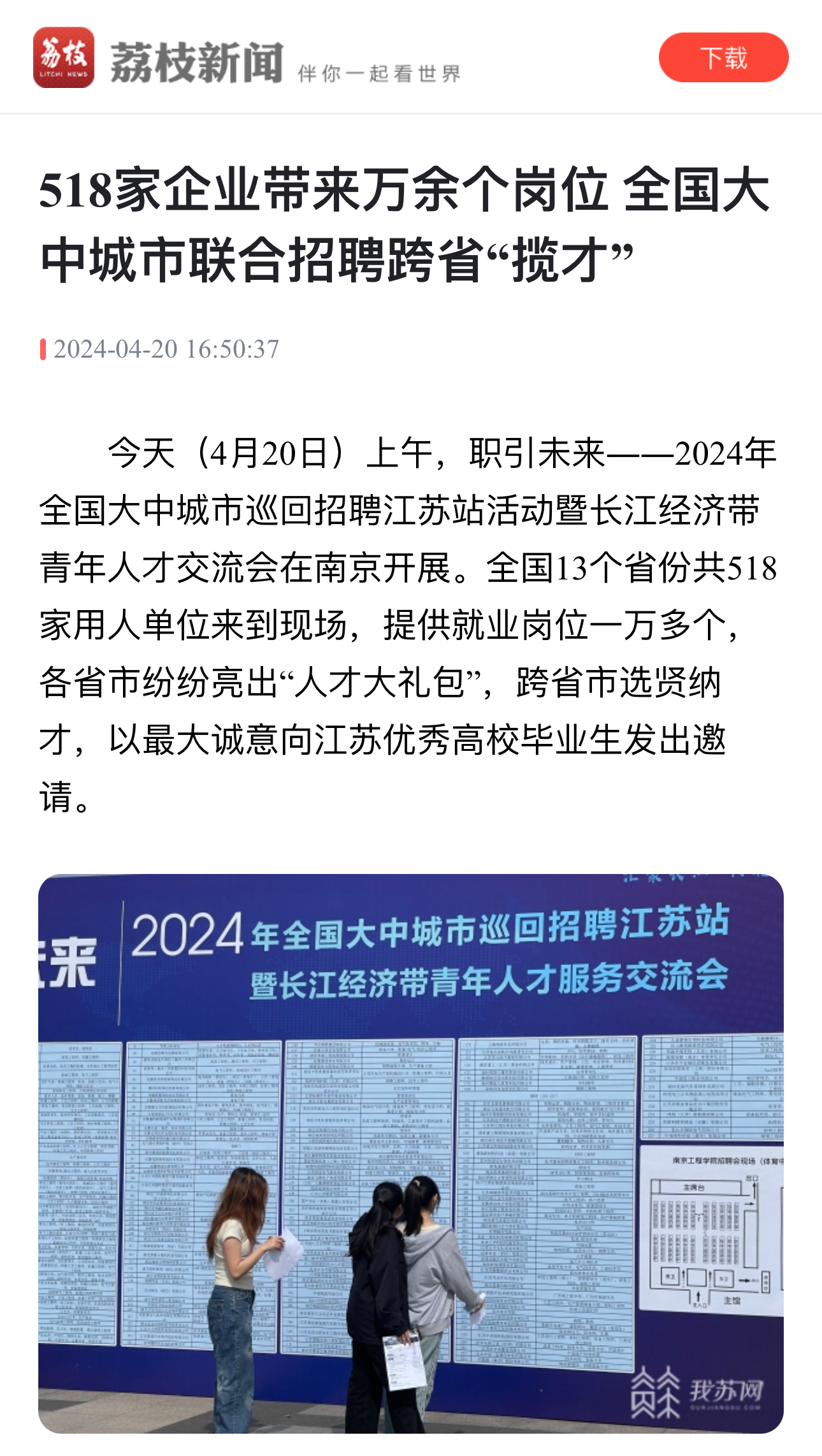 今天(4月20日)上午,职引未来――2024年全国大中城市巡回招聘江苏站活动暨长江经济带青年人才交流会在南京开展。全国13个省份共518家用人单位来到现场,提供就业岗位一万多个,各省市纷纷亮出“人才大礼包”,跨省市选贤纳才,以最大诚意向江苏优秀高校毕业生发出邀请。