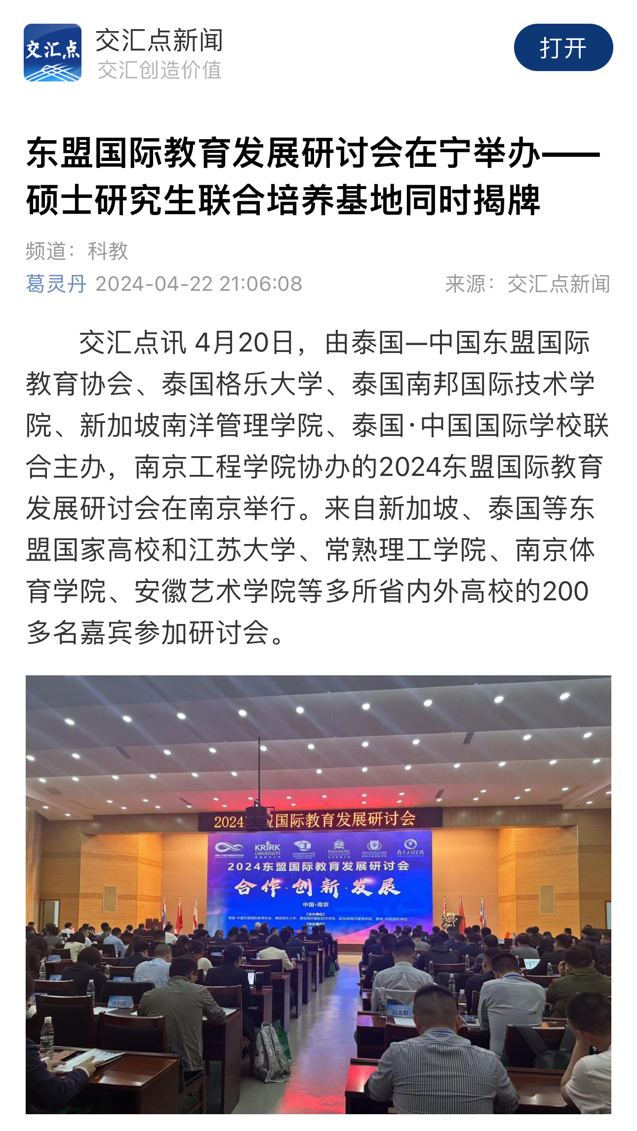交汇点讯 4月20日,由泰国—中国东盟国际教育协会、泰国格乐大学、泰国南邦国际技术学院、新加坡南洋管理学院、泰国·中国国际学校联合主办,15vip太阳集团官网协办的2024东盟国际教育发展研讨会在南京举行。来自新加坡、泰国等东盟国家高校和江苏大学、常熟理工学院、南京体育学院、安徽艺术学院等多所省内外高校的200多名嘉宾参加研讨会。