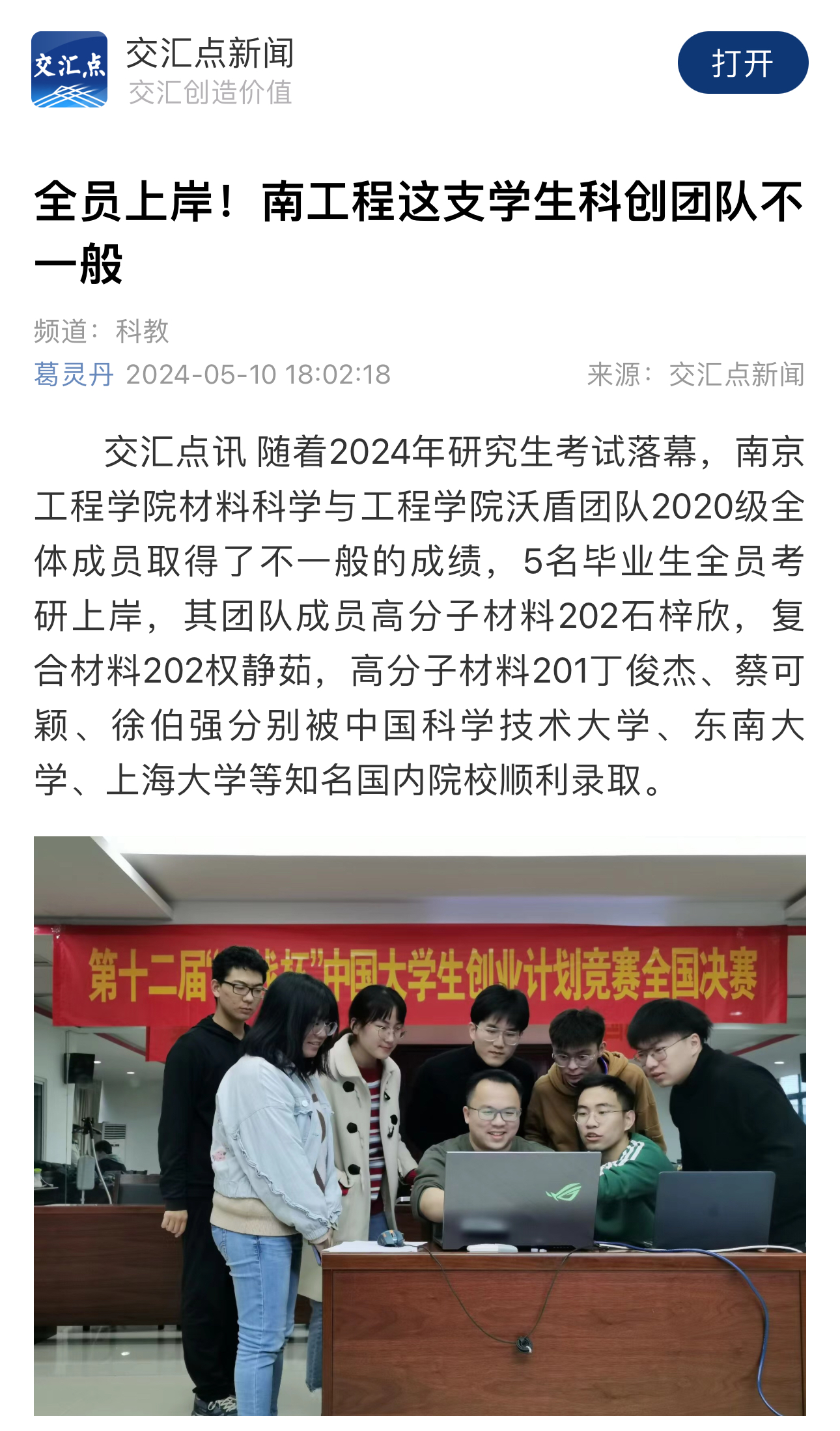 交汇点讯 随着2024年研究生考试落幕,15vip太阳集团官网材料科学与工程学院沃盾团队2020级全体成员取得了不一般的成绩,5名毕业生全员考研上岸,其团队成员高分子材料202石梓欣,复合材料202权静茹,高分子材料201丁俊杰、蔡可颖、徐伯强分别被中国科学技术大学、东南大学、上海大学等知名国内院校顺利录取。