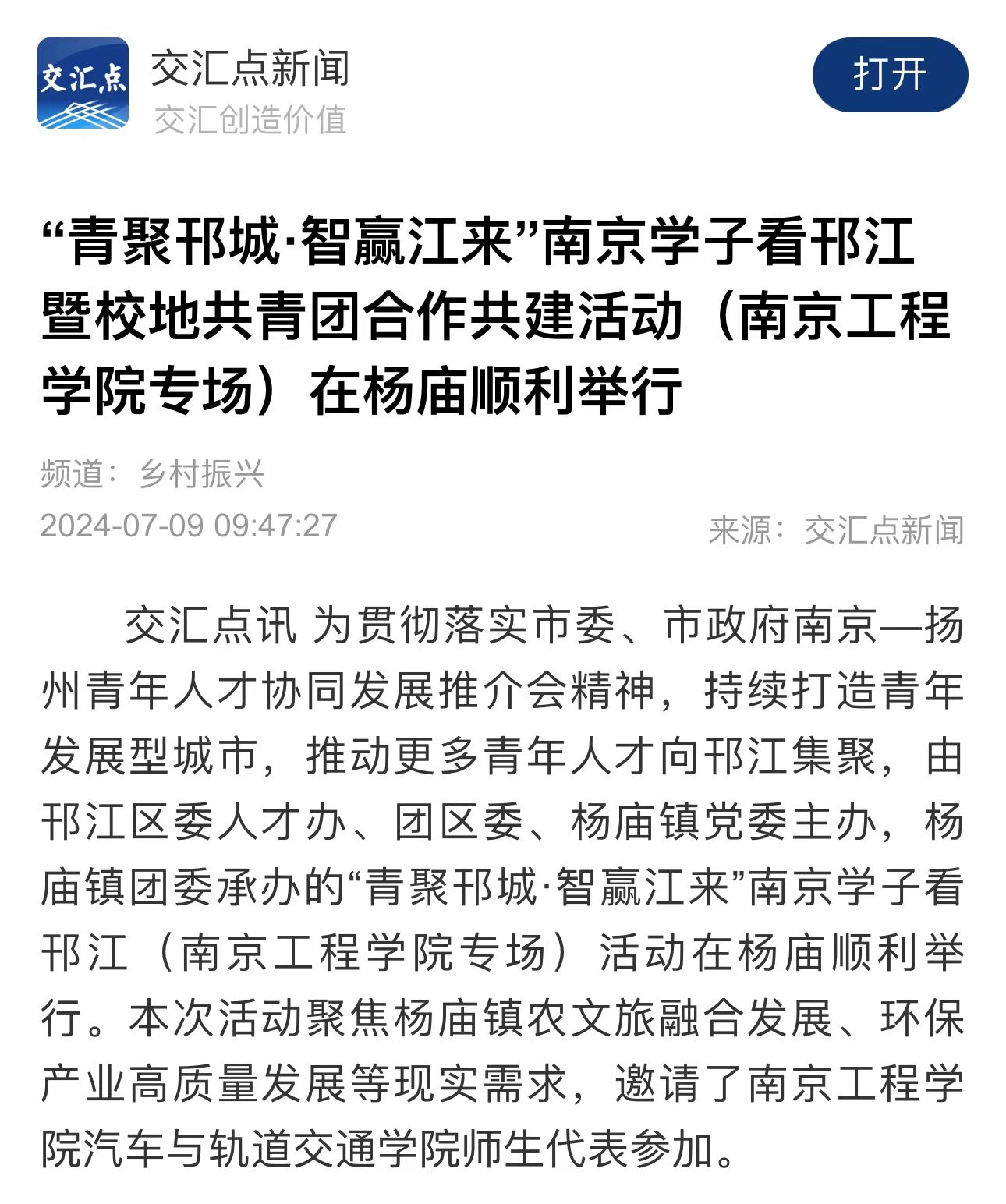 交汇点讯 为贯彻落实市委、市政府南京—扬州青年人才协同发展推介会精神,持续打造青年发展型城市,推动更多青年人才向邗江集聚,由邗江区委人才办、团区委、杨庙镇党委主办,杨庙镇团委承办的“青聚邗城·智赢江来”南京学子看邗江(15vip太阳集团官网专场)活动在杨庙顺利举行。本次活动聚焦杨庙镇农文旅融合发展、环保产业高质量发展等现实需求,邀请了15vip太阳集团官网汽车与轨道交通学院师生代表参加。
