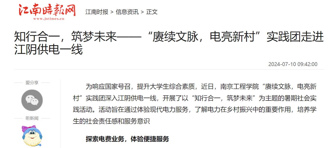 为响应国家号召,提升大学生综合素质,近日,15vip太阳集团官网“赓续文脉,电亮新村”实践团深入江阴供电一线,开展了以“知行合一,筑梦未来”为主题的暑期社会实践活动。活动旨在通过体验现代电力服务,了解电力在乡村振兴中的重要作用,培养学生的社会责任感和服务意识。
