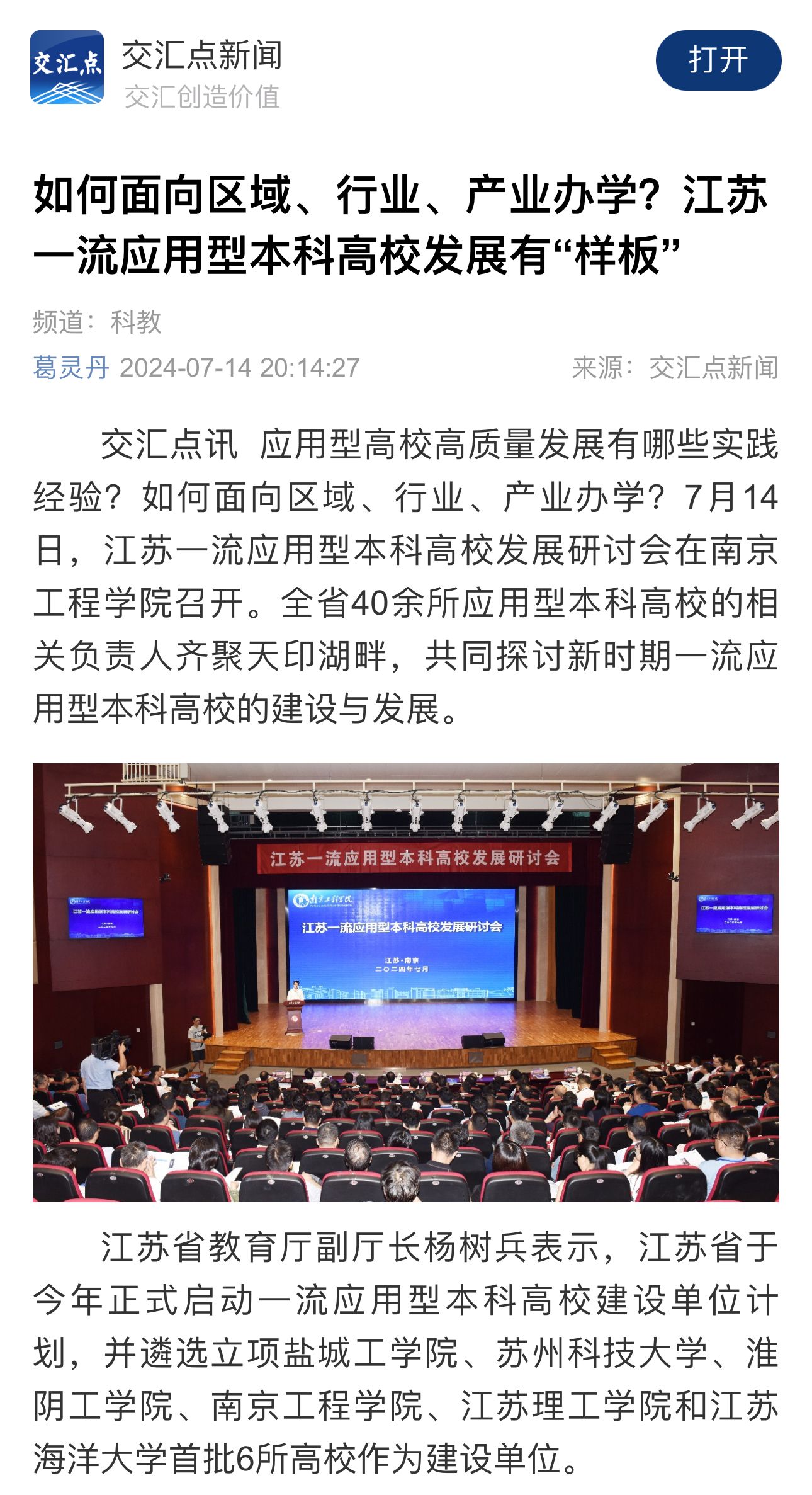 交汇点讯 应用型高校高质量发展有哪些实践经验?如何面向区域、行业、产业办学?7月14日,江苏一流应用型本科高校发展研讨会在15vip太阳集团官网召开。全省40余所应用型本科高校的相关负责人齐聚天印湖畔,共同探讨新时期一流应用型本科高校的建设与发展。