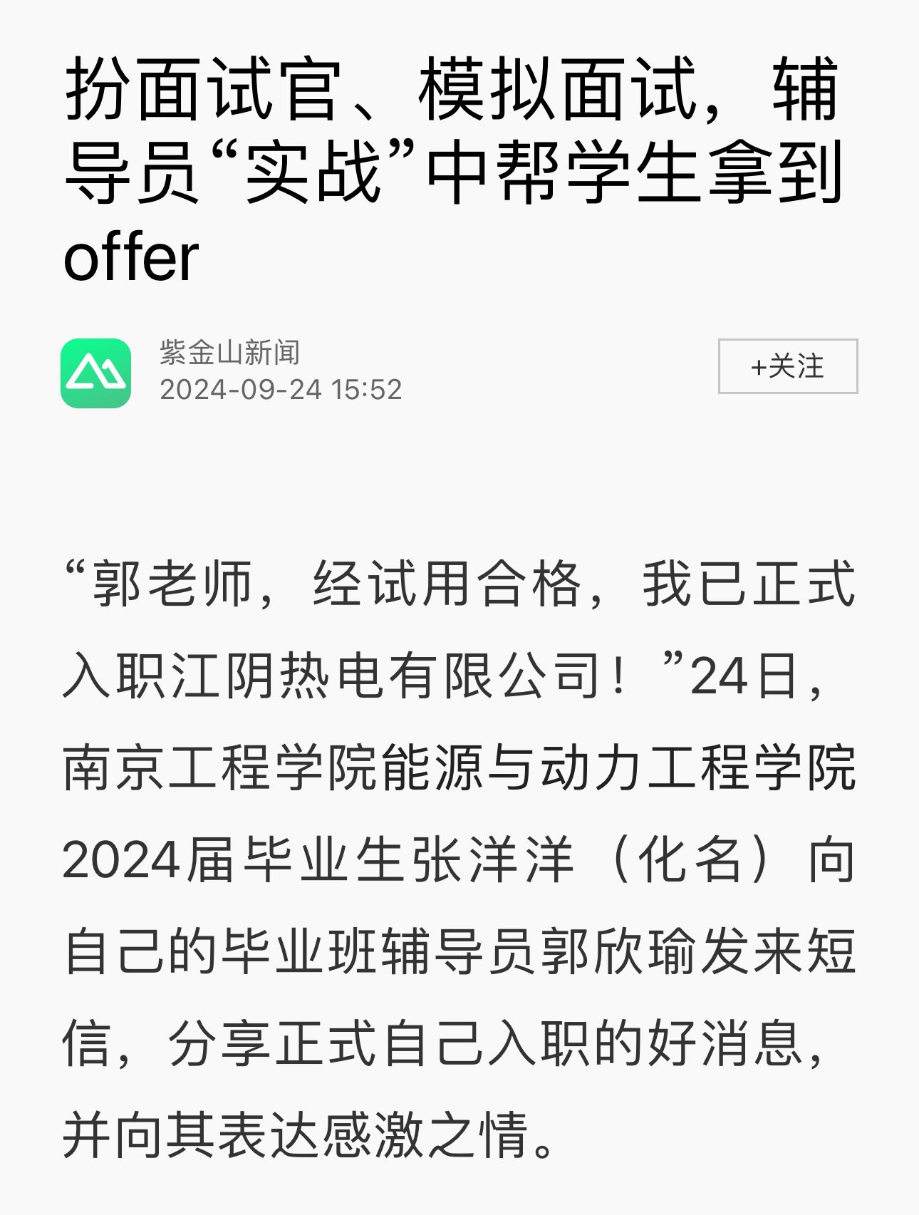 “郭老师,经试用合格,我已正式入职江阴热电有限公司!”24日,15vip太阳集团官网能源与动力工程学院2024届毕业生张洋洋(化名)向自己的毕业班辅导员郭欣瑜发来短信,分享正式自己入职的好消息,并向其表达感激之情。