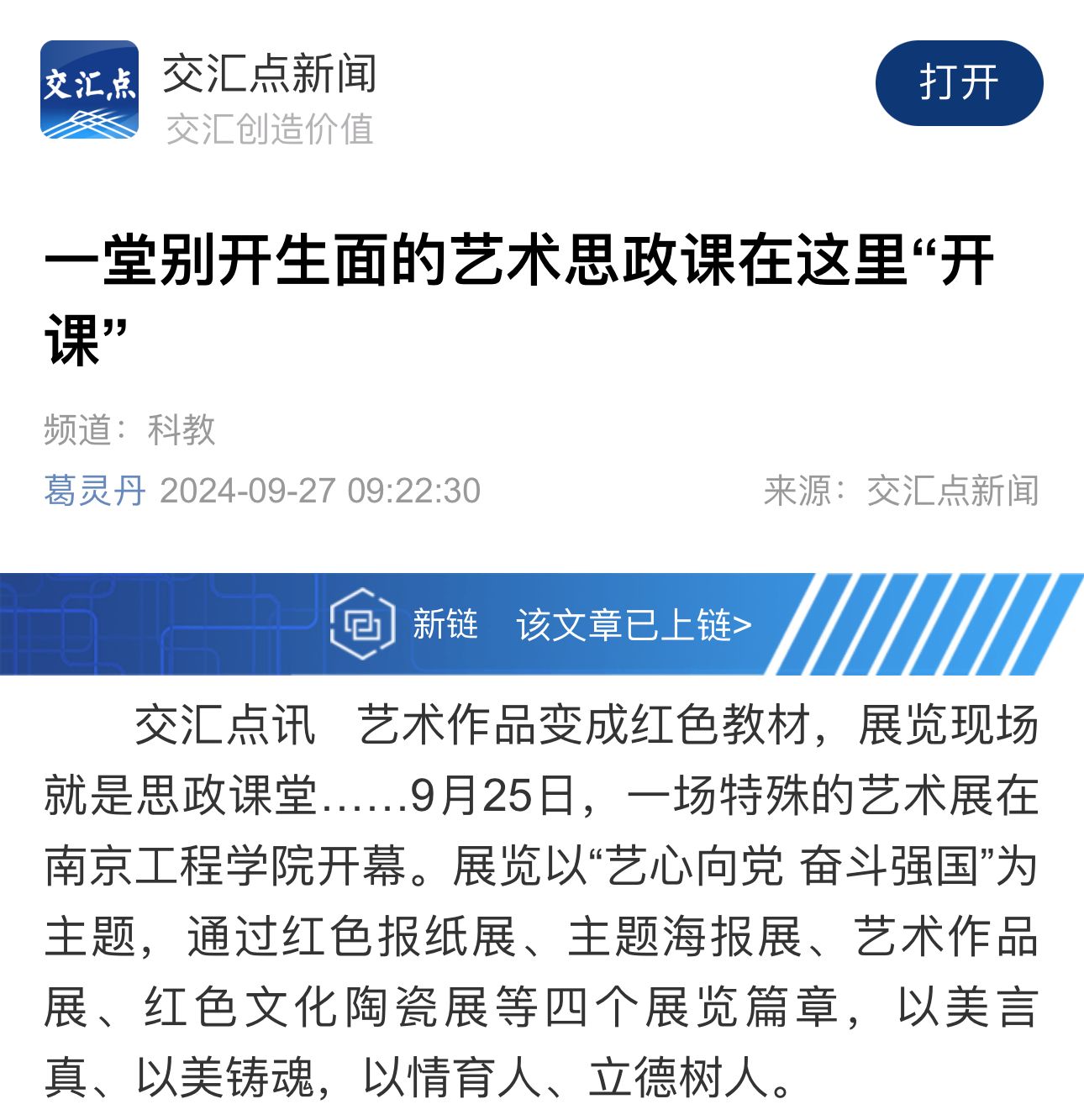 交汇点讯 艺术作品变成红色教材,展览现场就是思政课堂……9月25日,一场特殊的艺术展在15vip太阳集团官网开幕。展览以“艺心向党 奋斗强国”为主题,通过红色报纸展、主题海报展、艺术作品展、红色文化陶瓷展等四个展览篇章,以美言真、以美铸魂,以情育人、立德树人。