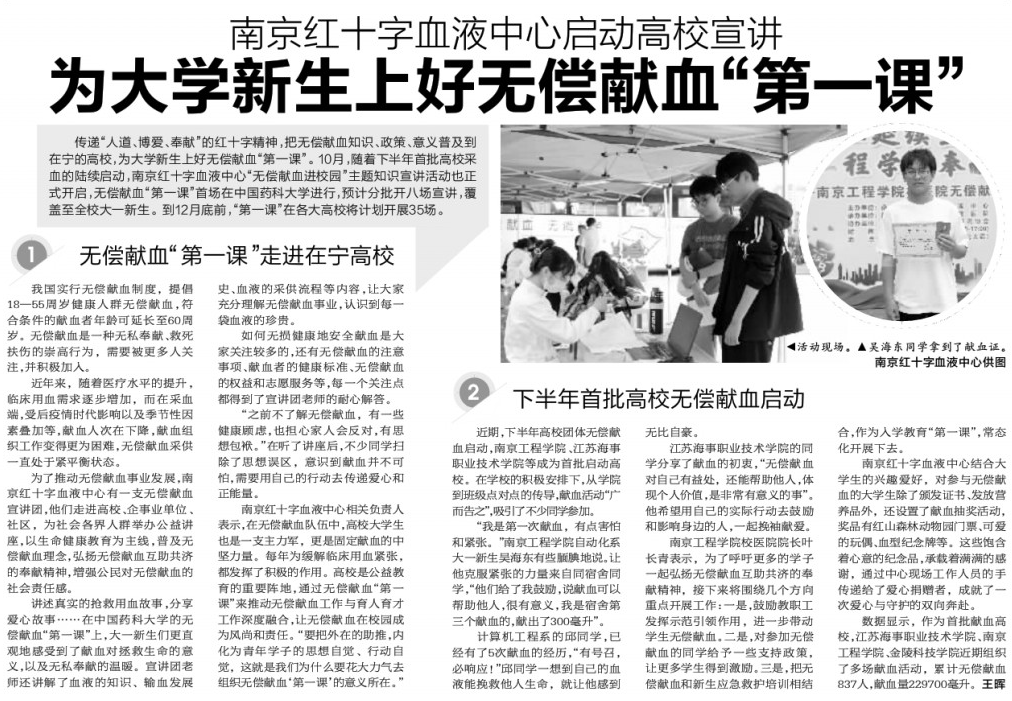 南京红十字血液中心相关负责人表示,在无偿献血队伍中,高校大学生也是一支主力军,更是固定献血的中坚力量。每年为缓解临床用血紧张,都发挥了积极的作用。高校是公益教育的重要阵地,通过无偿献血“第一课”来推动无偿献血工作与育人育才工作深度融合,让无偿献血在校园成为风尚和责任。“要把外在的助推,内化为青年学子的思想自觉、行动自觉,这就是我们为什么要花大力气去组织无偿献血‘第一课’的意义所在。”