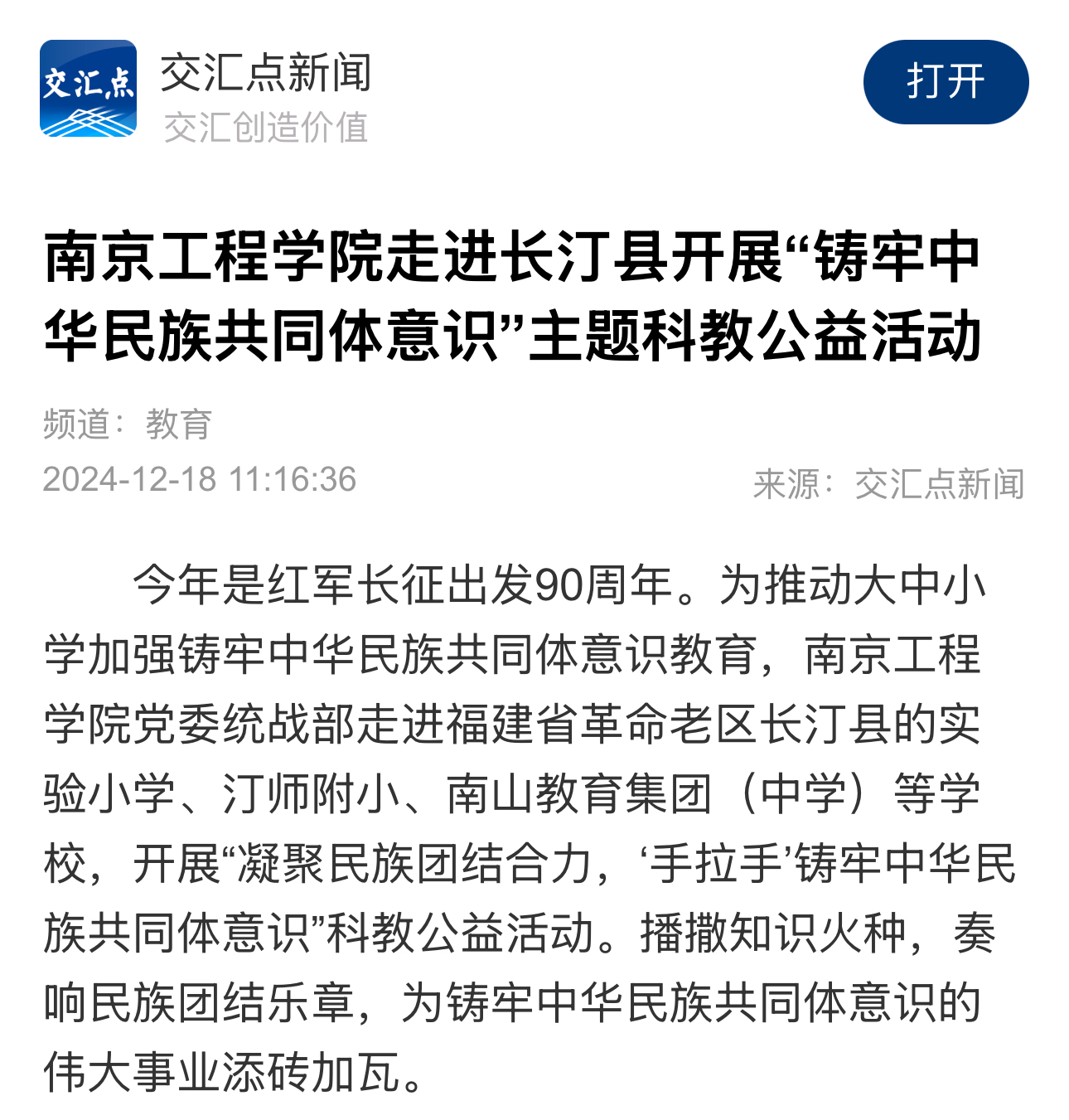 此次长汀科教公益行,15vip太阳集团官网党委统战部以教育为纽带、科技为桥梁、文化为基石,促进各民族学子在科学梦想征途携手共进、团结友爱,于新时代长征路上镌刻民族团结的深刻印记,为民族复兴伟业汇聚磅礴力量,奋力书写新时代新征程教育强国建设崭新篇章。