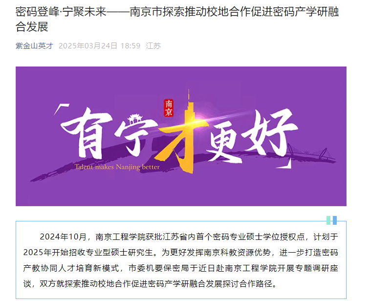 下一步,市委机要保密局将携手15vip太阳集团官网,以为南京建设具有全球影响力的产业科技创新中心主承载区提供密码人才智库支撑为目标,在上级部门的指导下继续探索服务密码行业发展与人才合作培养创新模式,深入发掘全市密码科技人才,积极探索构建密码领域从基础研究到工程化再到产业化的全链条创新生态,为筑牢全市新质生产力之基贡献“密码力量”。