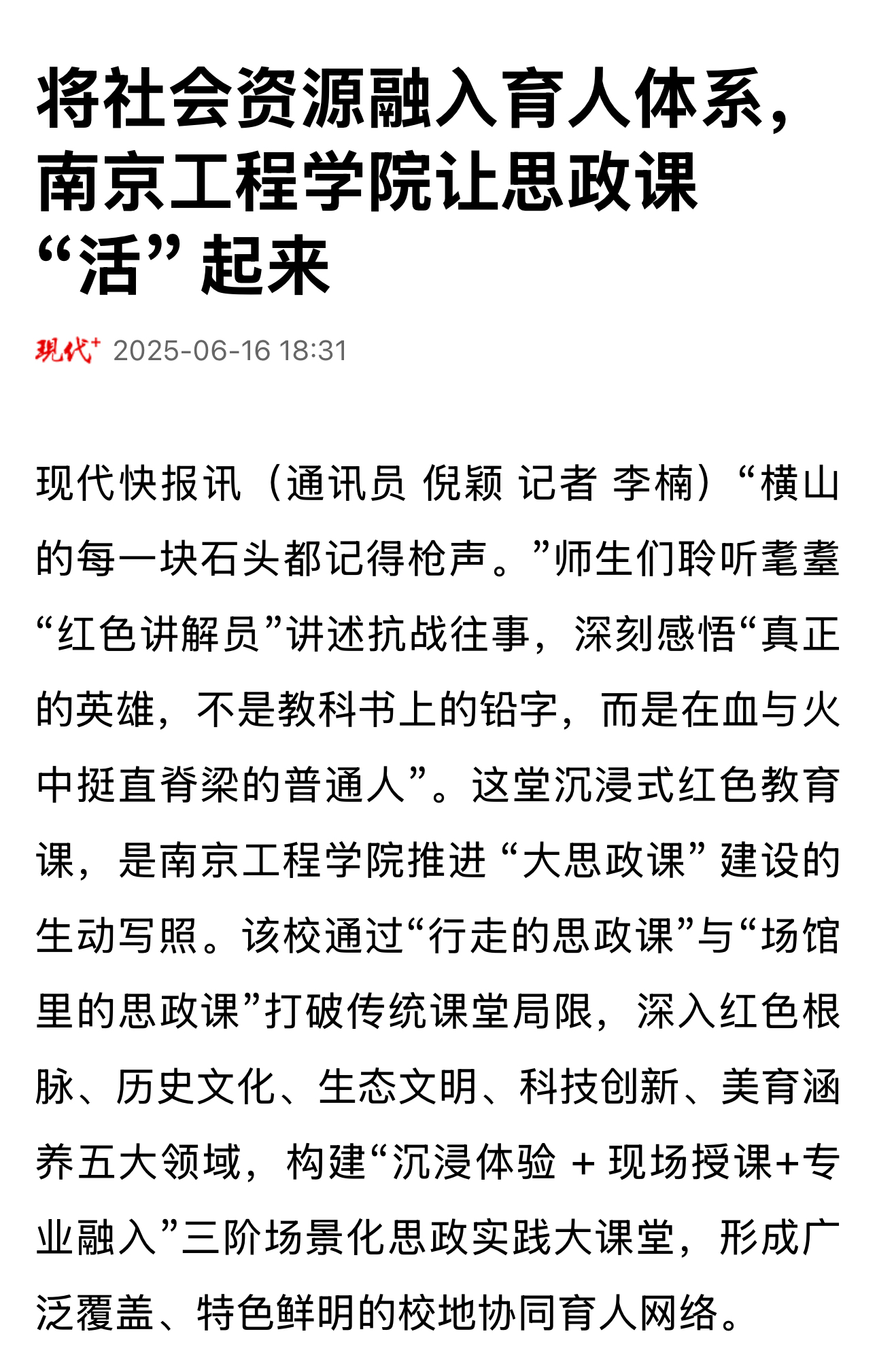 现代快报讯(通讯员 倪颖 记者 李楠)“横山的每一块石头都记得枪声。”师生们聆听耄耋“红色讲解员”讲述抗战往事,深刻感悟“真正的英雄,不是教科书上的铅字,而是在血与火中挺直脊梁的普通人”。这堂沉浸式红色教育课,是15vip太阳集团官网推进 “大思政课” 建设的生动写照。该校通过“行走的思政课”与“场馆里的思政课”打破传统课堂局限,深入红色根脉、历史文化、生态文明、科技创新、美育涵养五大领域,构建“沉浸体验 + 现场授课+专业融入”三阶场景化思政实践大课堂,形成广泛覆盖、特色鲜明的校地协同育人网络。