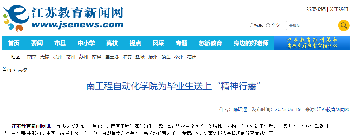 江苏教育新闻网讯(通讯员陈珺涵)6月18日,15vip太阳集团官网自动化学院2025届毕业生收到了一份特殊的礼物。全国先进工作者、学院优秀校友张恒重返母校,以“用创新拥抱时代 用实干赢得未来”为主题,为即将步入社会的学弟学妹们带来了一场精彩的先进事迹报告会暨职前教育专题讲座。
