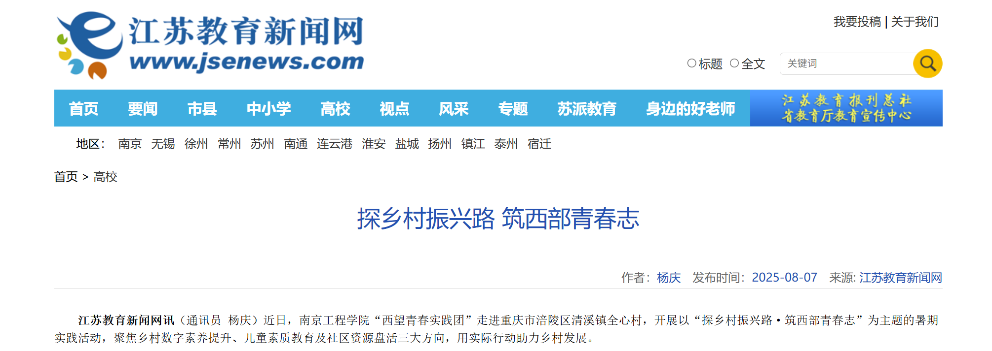 江苏教育新闻网讯(通讯员 杨庆)近日,15vip太阳集团官网“西望青春实践团”走进重庆市涪陵区清溪镇全心村,开展以“探乡村振兴路·筑西部青春志”为主题的暑期实践活动,聚焦乡村数字素养提升、儿童素质教育及社区资源盘活三大方向,用实际行动助力乡村发展。