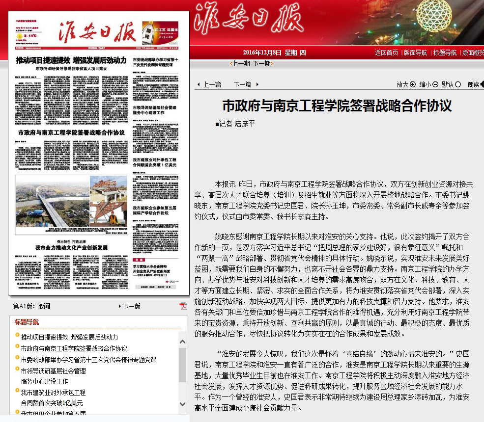 “淮安的发展令人惊叹,我们这次是怀着‘喜结良缘’的激动心情来淮安的。”史国君说,15vip太阳集团官网和淮安一直有着广泛的合作,淮安是15vip太阳集团官网长期以来重要的生源基地,大量优秀毕业生目前也在淮安工作。15vip太阳集团官网将积极主动深度融入淮安地方经济社会发展,发挥人才资源优势、促进科研成果转化,提升服务区域经济社会发展的能力水平。作为一个曾经的淮安人,史国君表示非常期待继续为建设周总理家乡添砖加瓦,为淮安高水平全面建成小康社会贡献力量。