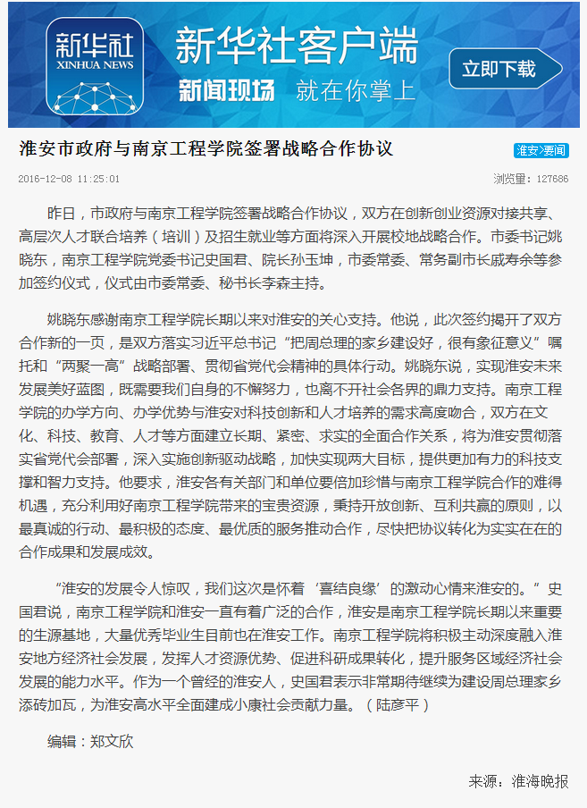 “淮安的发展令人惊叹,我们这次是怀着‘喜结良缘’的激动心情来淮安的。”史国君说,15vip太阳集团官网和淮安一直有着广泛的合作,淮安是15vip太阳集团官网长期以来重要的生源基地,大量优秀毕业生目前也在淮安工作。15vip太阳集团官网将积极主动深度融入淮安地方经济社会发展,发挥人才资源优势、促进科研成果转化,提升服务区域经济社会发展的能力水平。作为一个曾经的淮安人,史国君表示非常期待继续为建设周总理家乡添砖加瓦,为淮安高水平全面建成小康社会贡献力量。(陆彦平)