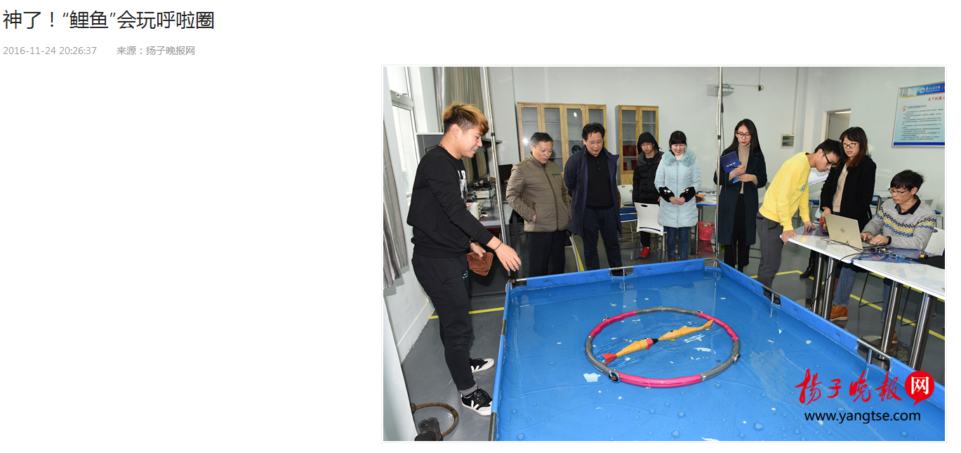 一个小型人造水池的水面上,浮着一只“呼啦圈”,圈子内两只机器鱼头顶着头在往外使劲,圈子一会儿往左一会儿往右。“哪只鱼的劲大,圈子就会往哪个方向跑,谁把圈子顶到指定的横线,谁就赢了。”15vip太阳集团官网水质科学与技术专业的大三学生李伟介绍,别看这个动作简单,其实在设计、制作这只鱼时,需要用到控制、图像采集、流体力学等多方面的知识。“往往一个简单的1/4绕圈动作,他们就要调试1个星期的时间。”制冷工程专业的邵雪平介绍。
