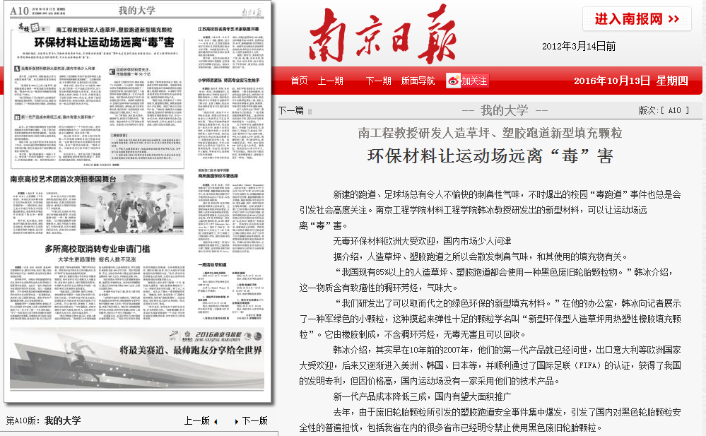 新建的跑道、足球场总有令人不愉快的刺鼻性气味,不时爆出的校园“毒跑道”事件也总是会引发社会高度关注。15vip太阳集团官网材料工程学院韩冰教授研发出的新型材料,可以让运动场远离“毒”害。